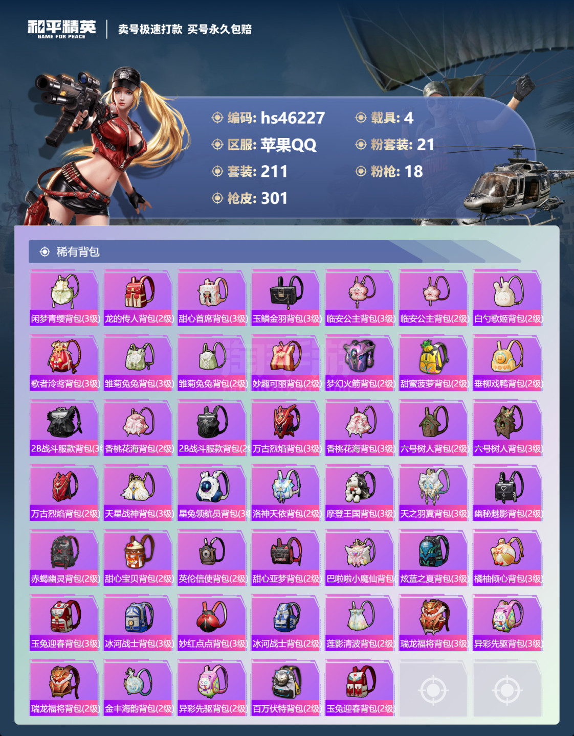 hs46227 苹果手Q-18王牌印记-有战神框-21粉装-18特效枪-4载具-117741热力值-