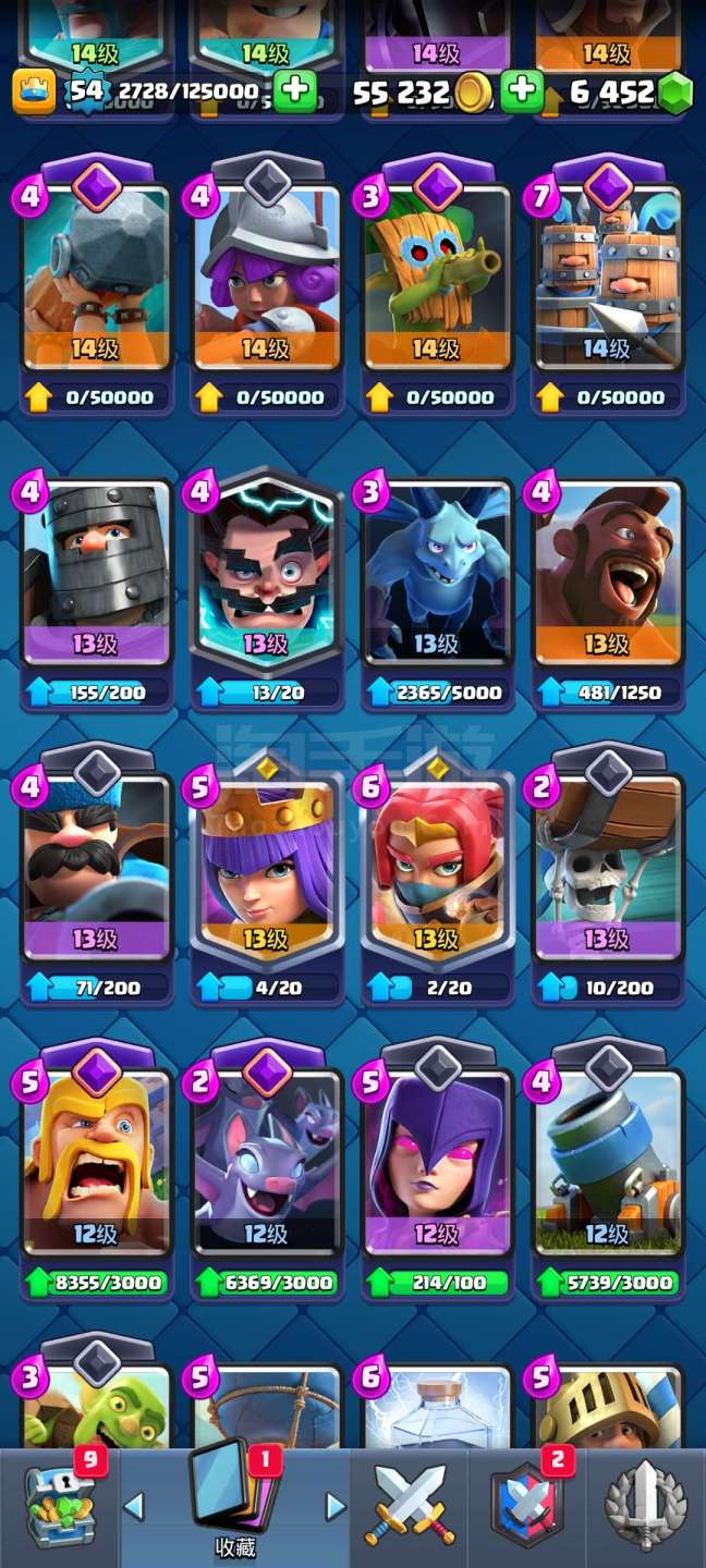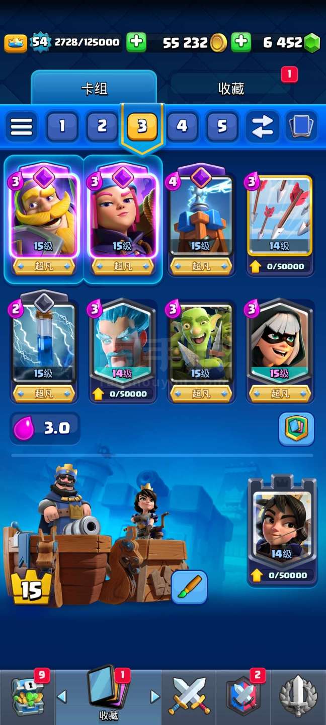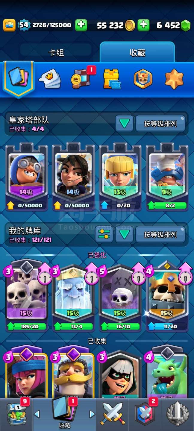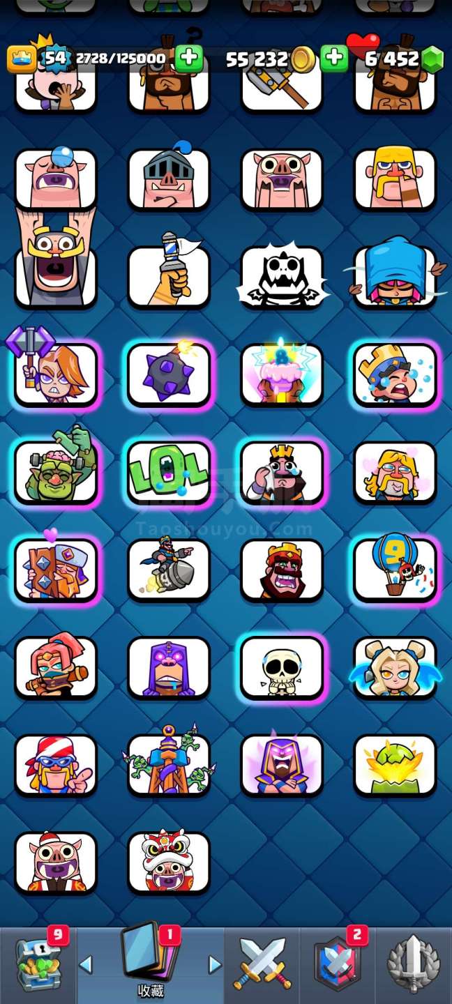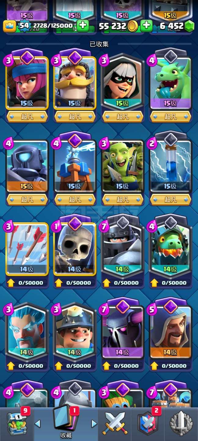 皇室战争【安卓QQ】54级,全卡,国王塔15级,8张15级卡,15张觉醒卡,超多表情和装扮