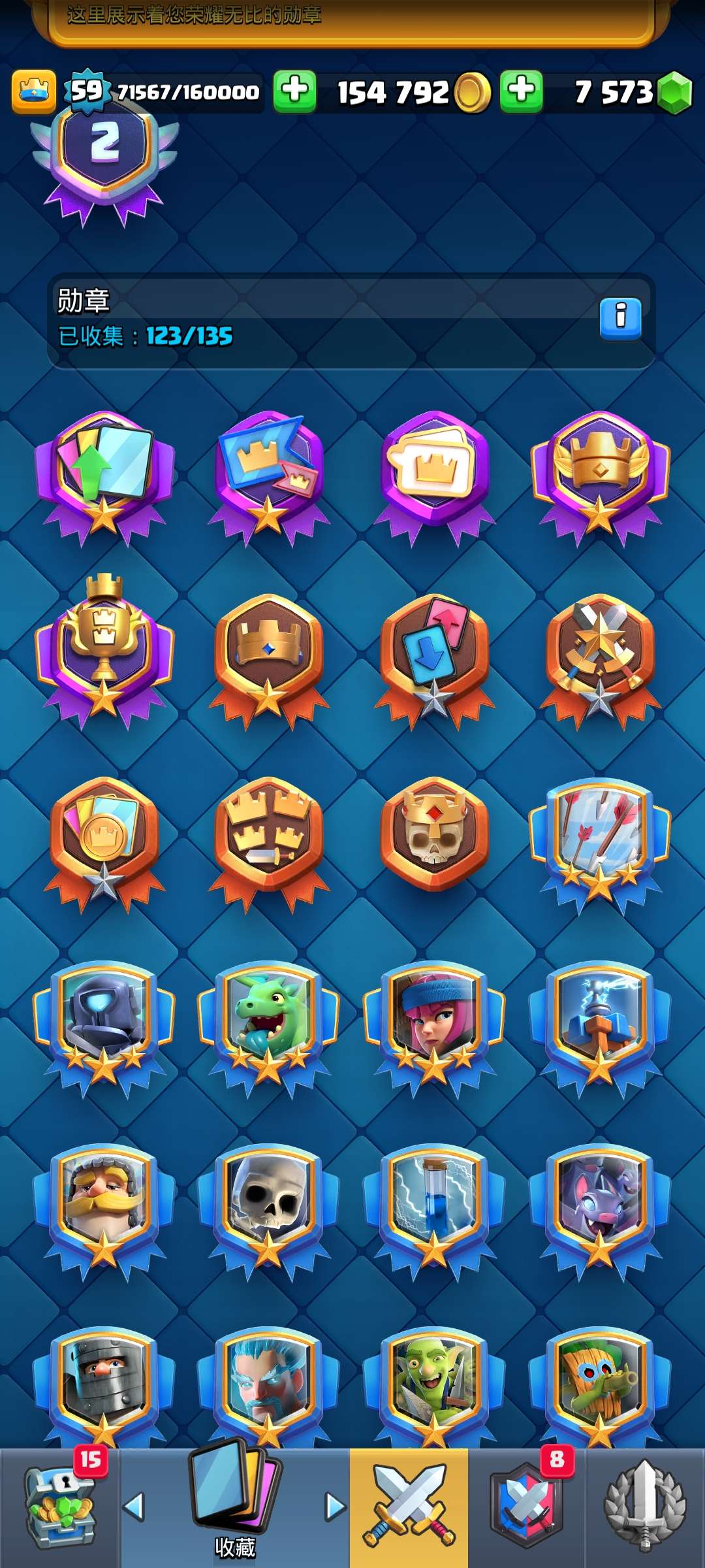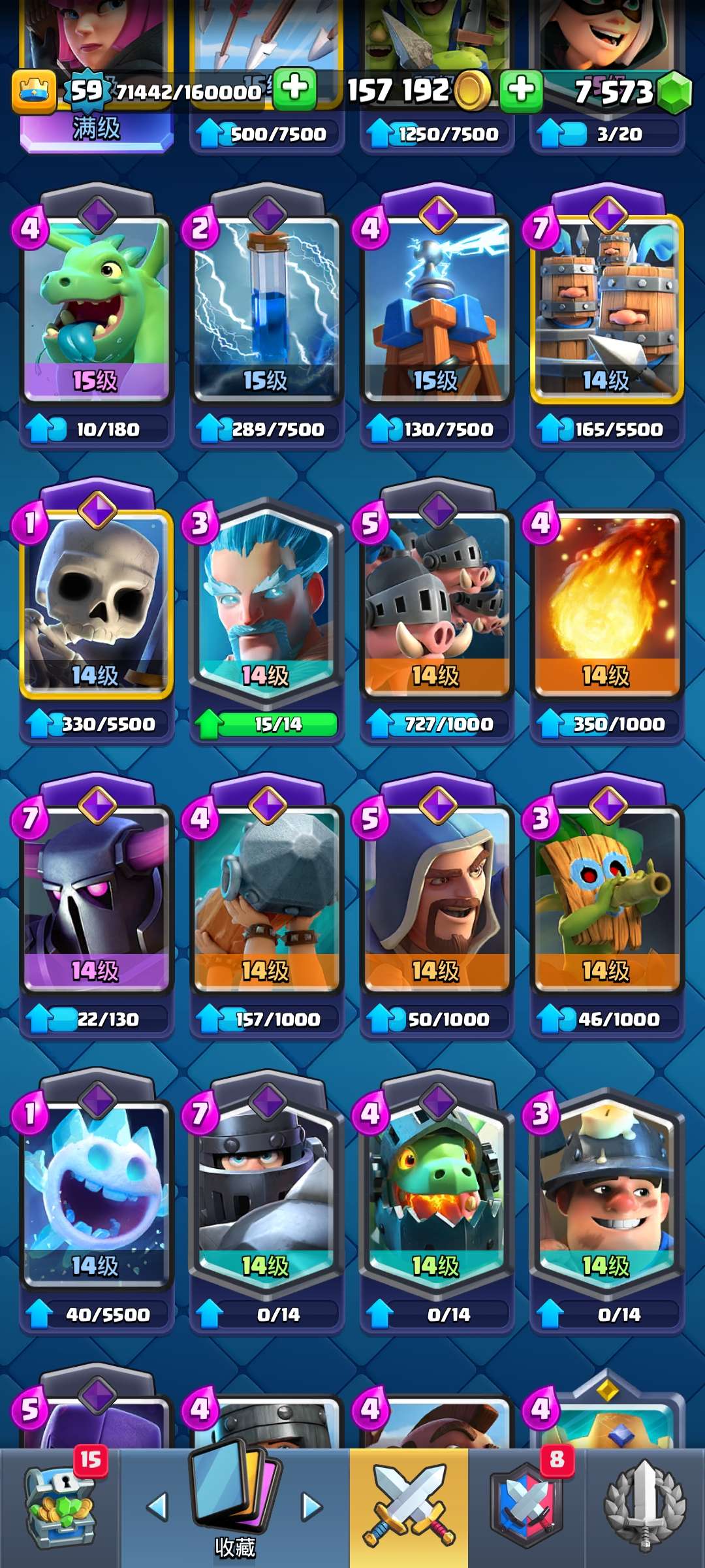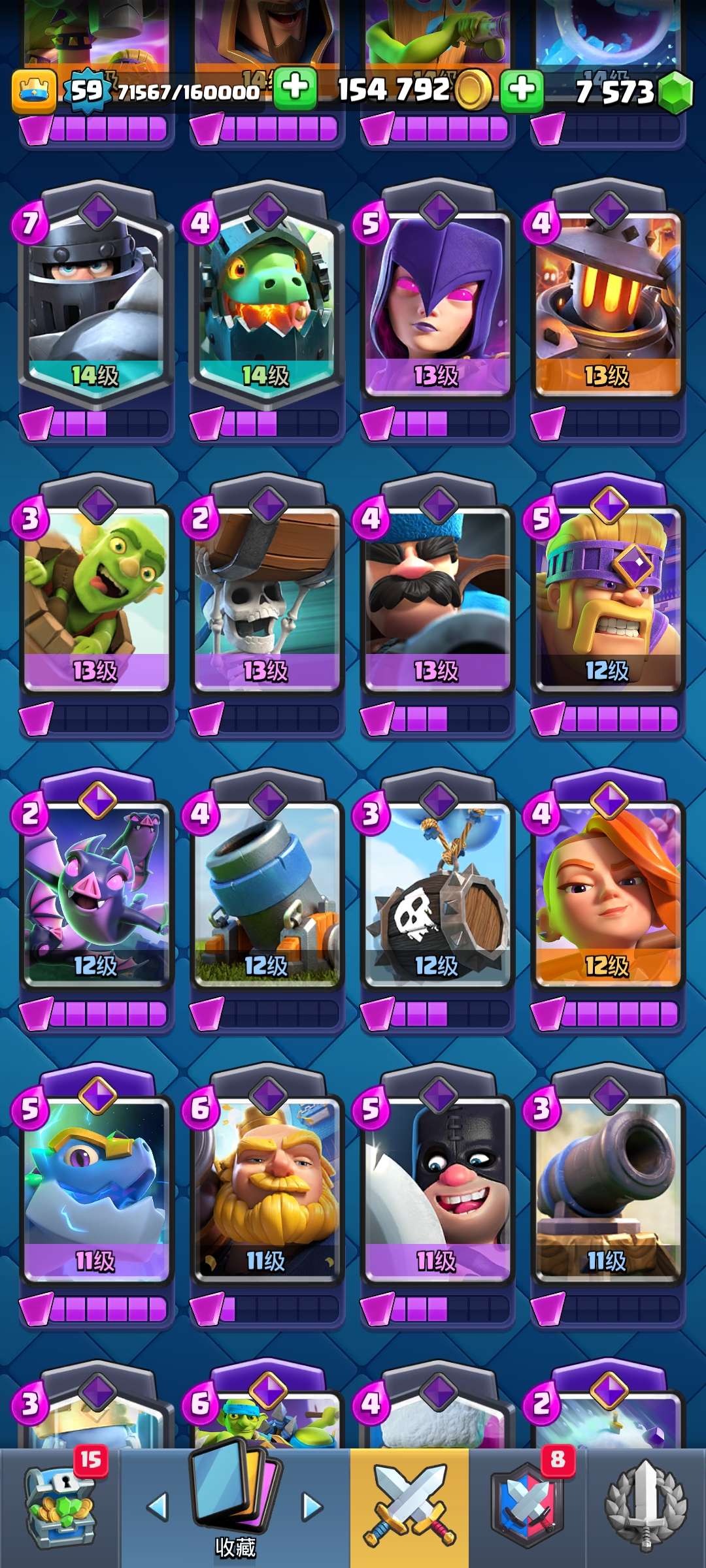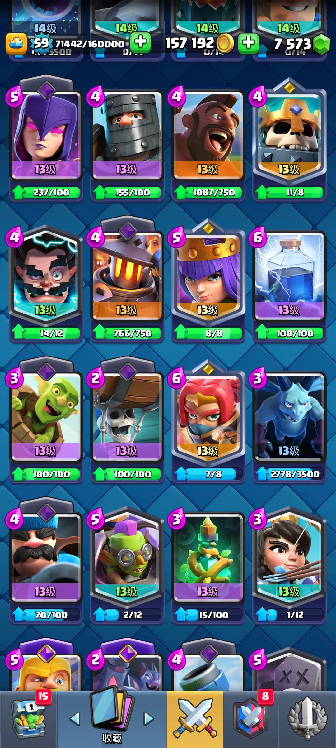 59级,全卡,国王塔15级,2张16级卡,8张15级卡,15张觉醒卡,黄金火枪手,超多表情和装扮,还有很多宝箱没开