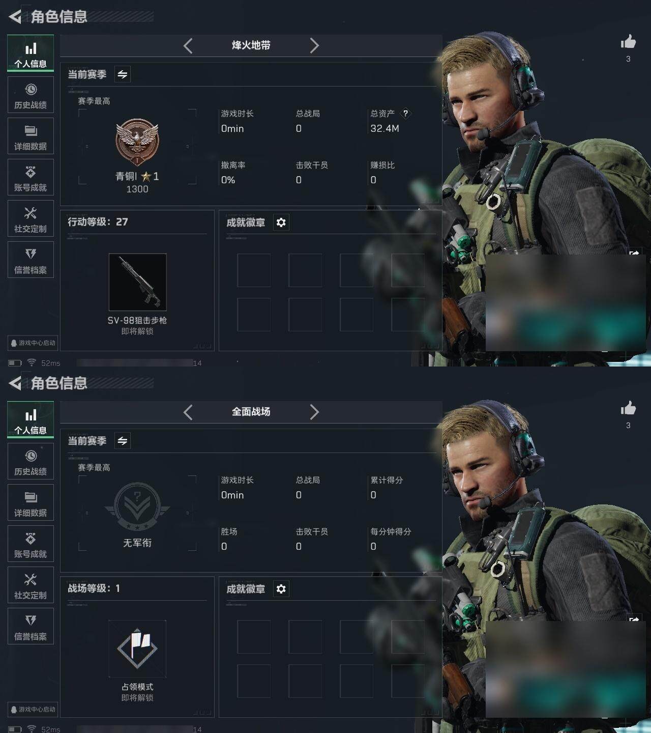 总资产:32.4M, 哈夫币:14508K ;总资产(M):32M/哈夫币(K):14508K/哈夫币(K):14508K/全面战场等级:1_段位:无段位/烽火地带等级:27_段位:青铜
