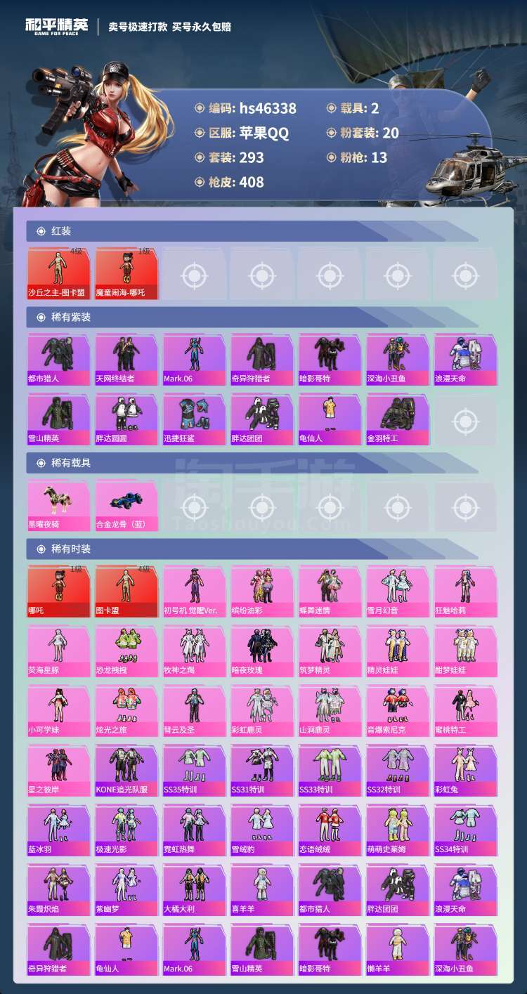 hs46338 苹果手Q-17王牌印记-20粉装-13特效枪-2载具-145903热力值-293套装