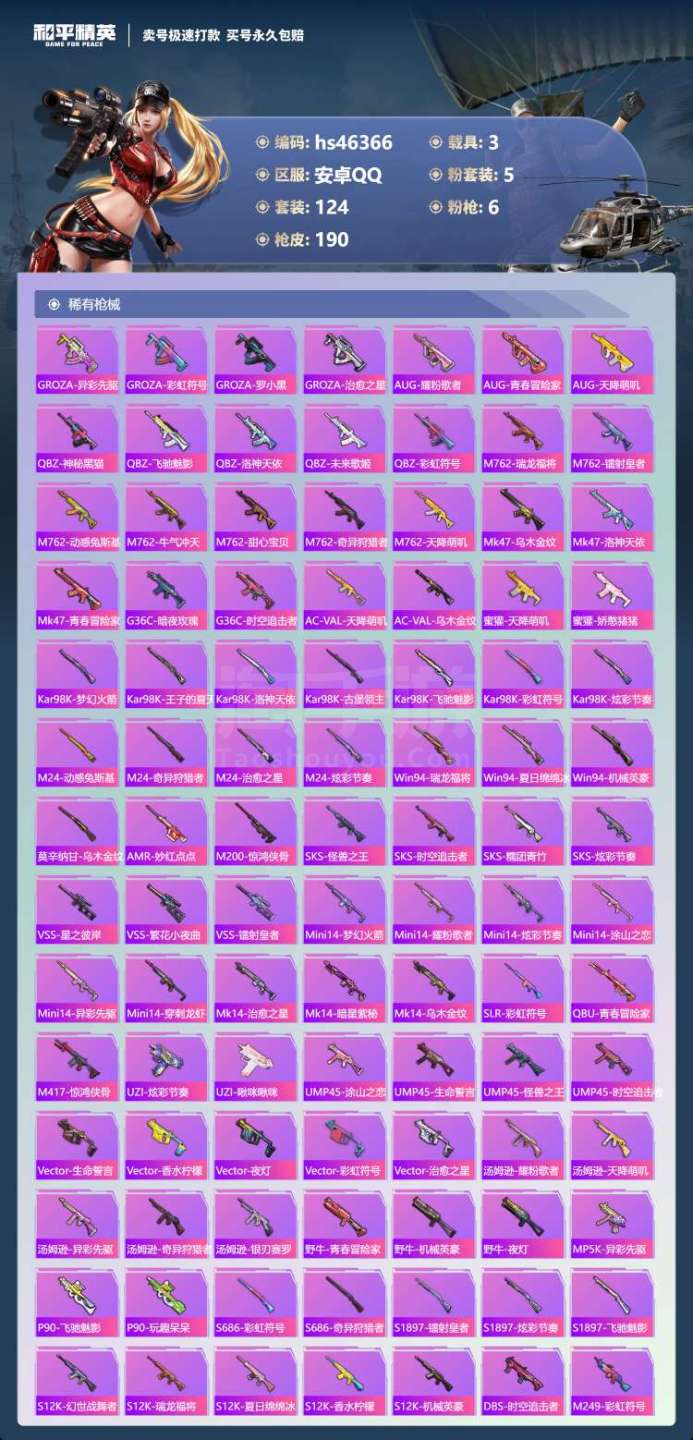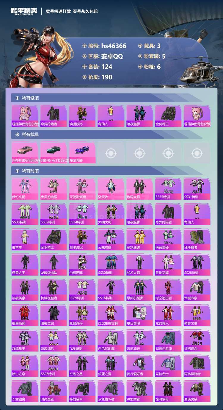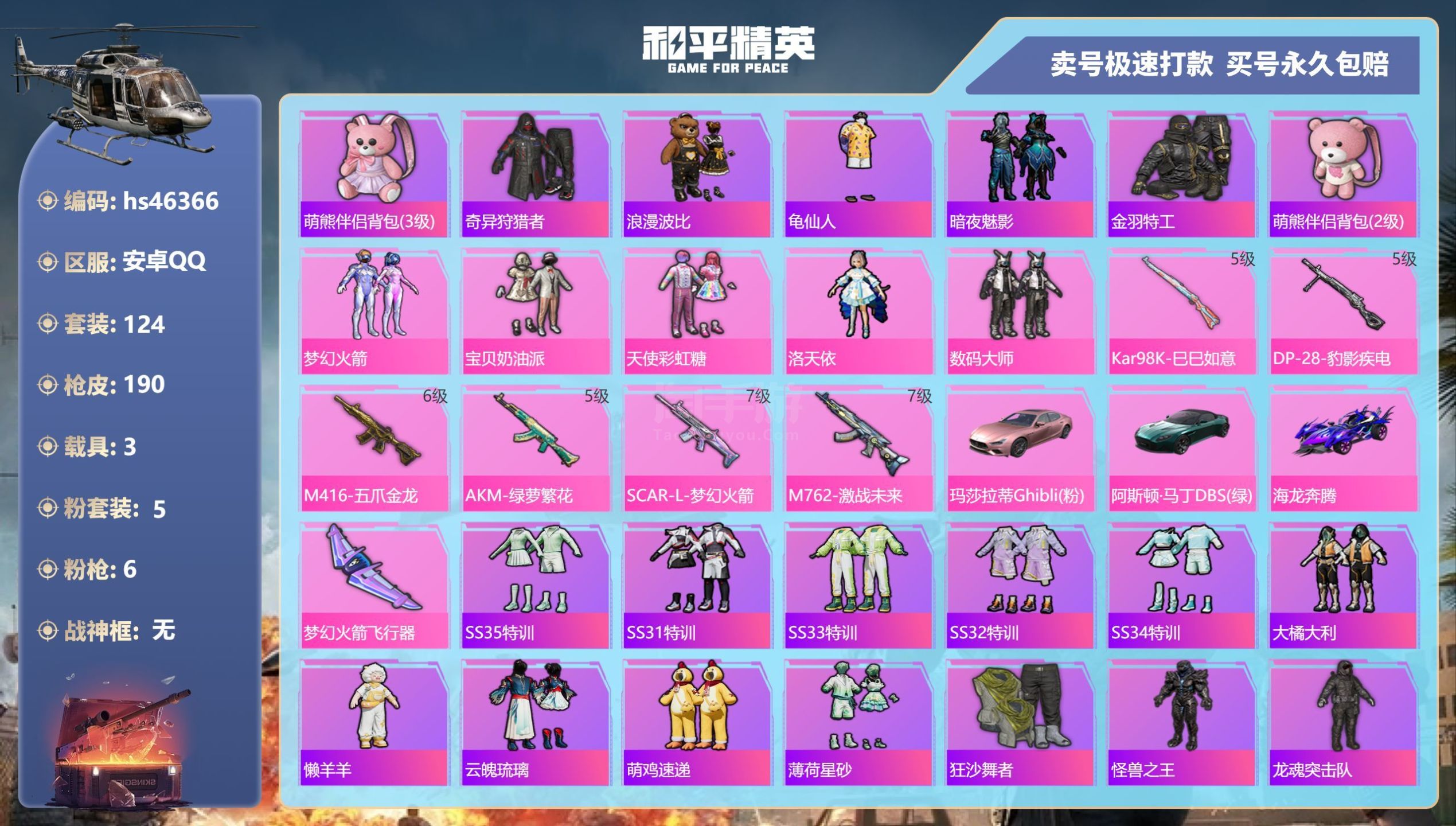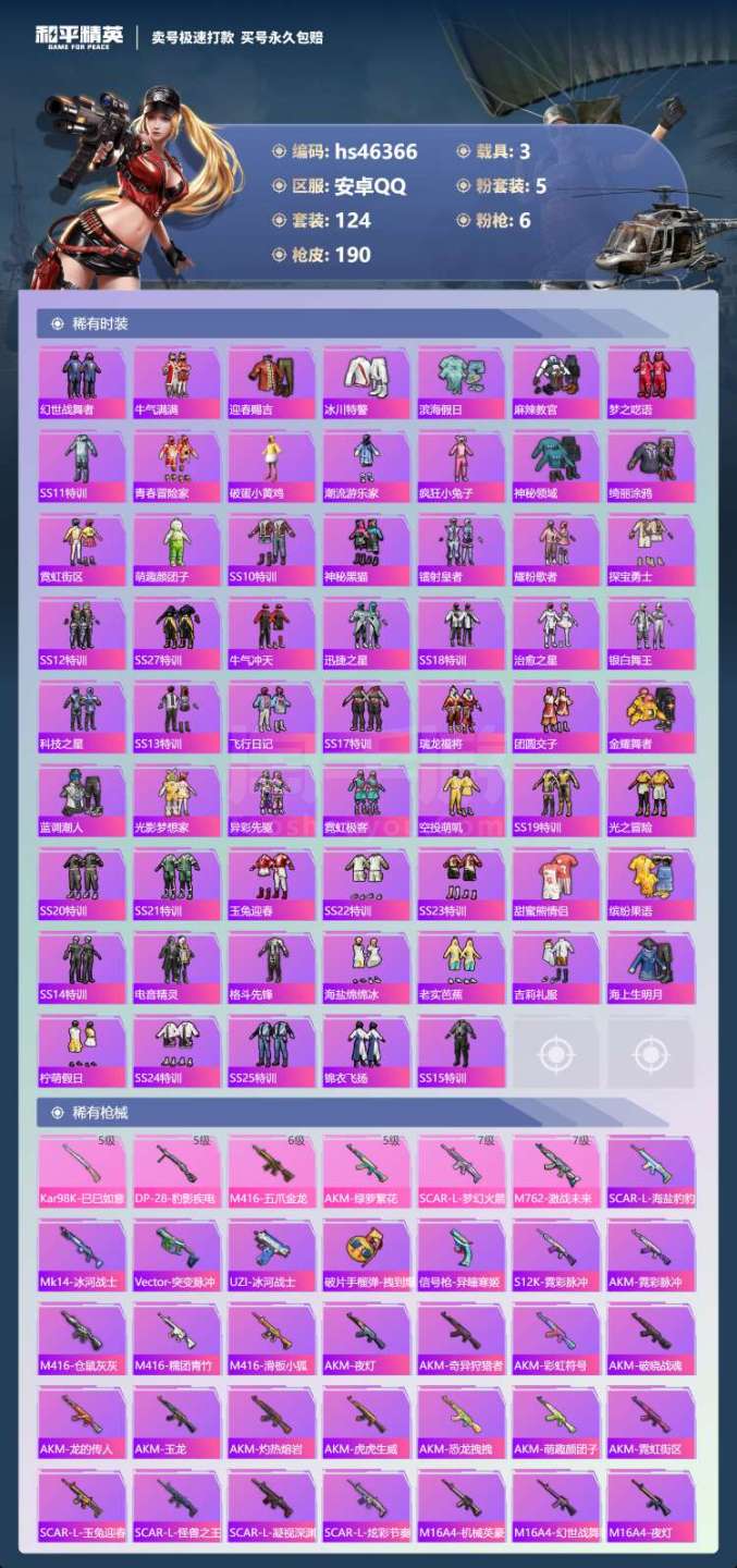 hs46366 安卓手Q-16王牌印记-5粉装-6特效枪-3载具-62246热力值-124套装-19