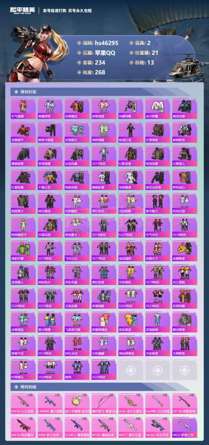 hs46295 苹果手Q-18王牌印记-21粉装-13特效枪-2载具-96862热力值-234套装-