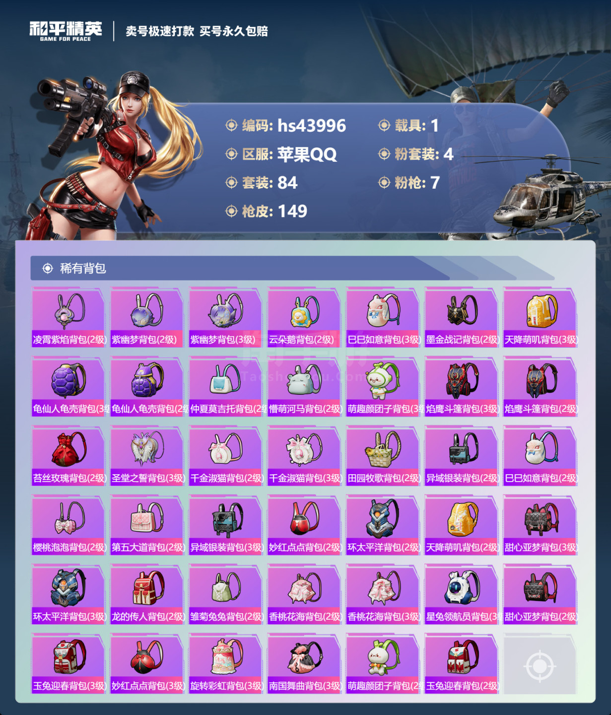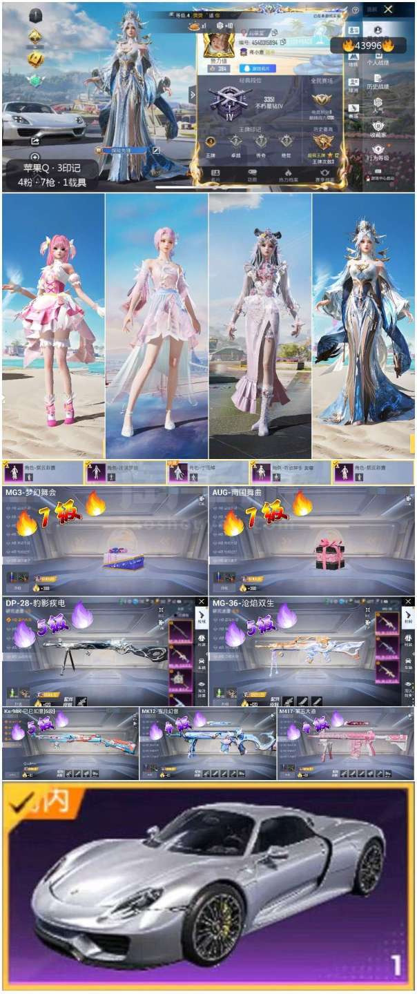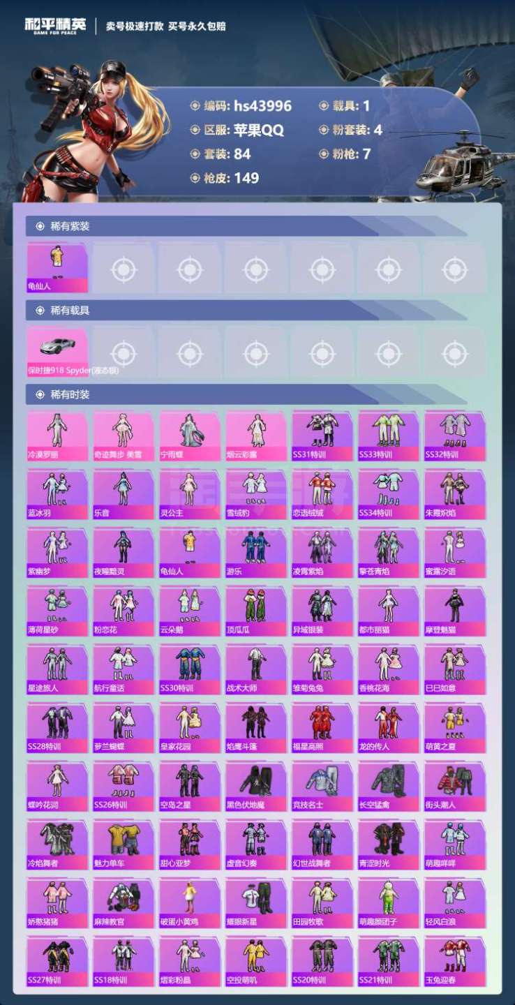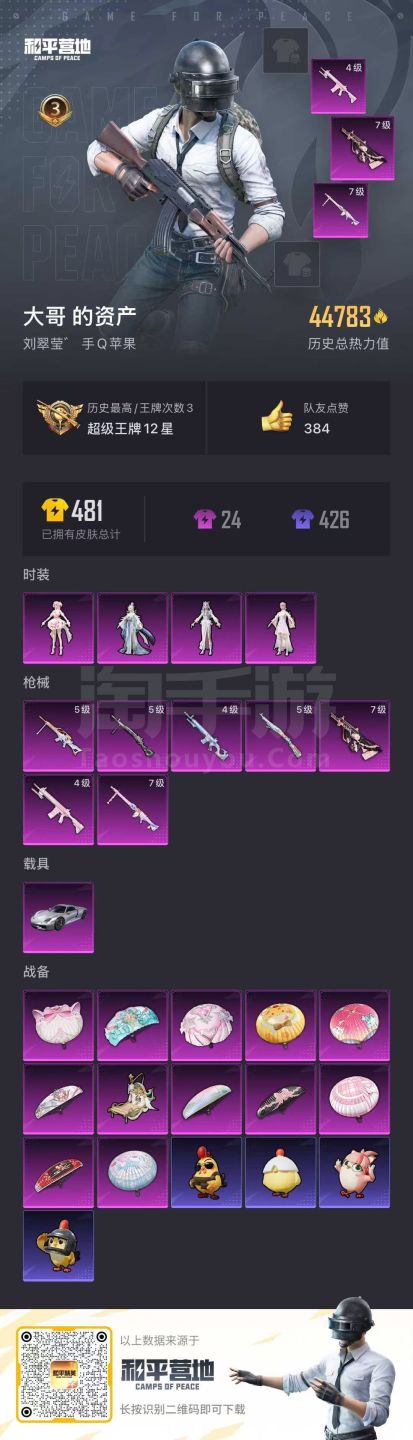 hs43996 苹果手Q-3王牌印记-4粉装-7特效枪-1载具-44783热力值-84套装-149枪
