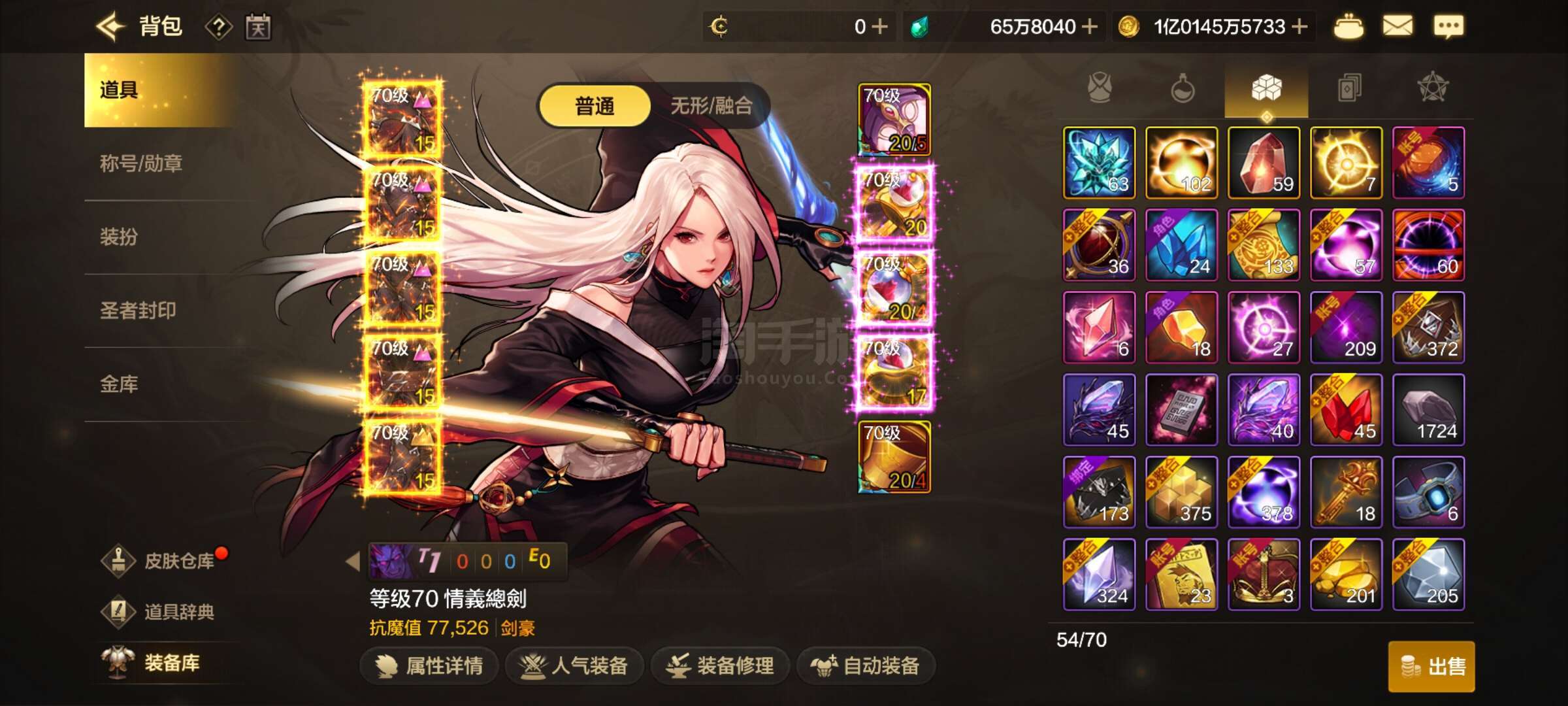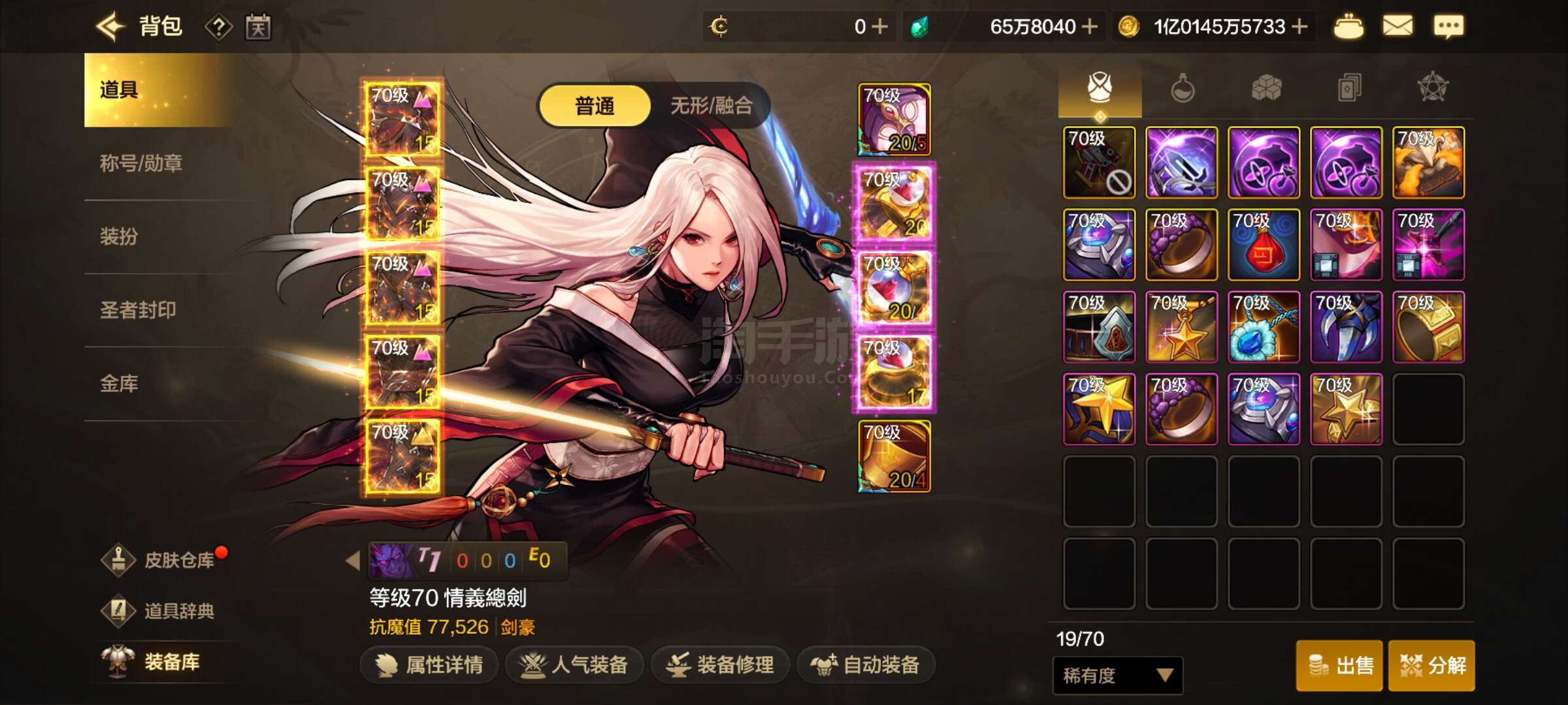 DNF手游【安卓QQ】70级剑豪抗魔77000,+20的70史诗光剑,泰拉65W,金币1亿,业火皮甲一套,天空套