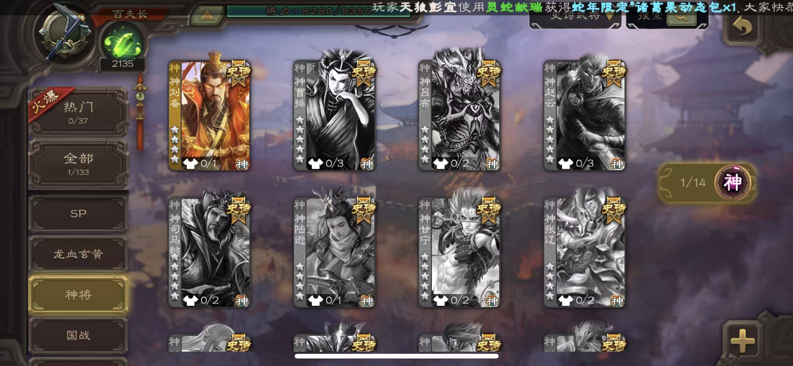 百夫长70宝珠神刘备三卡2100将魂