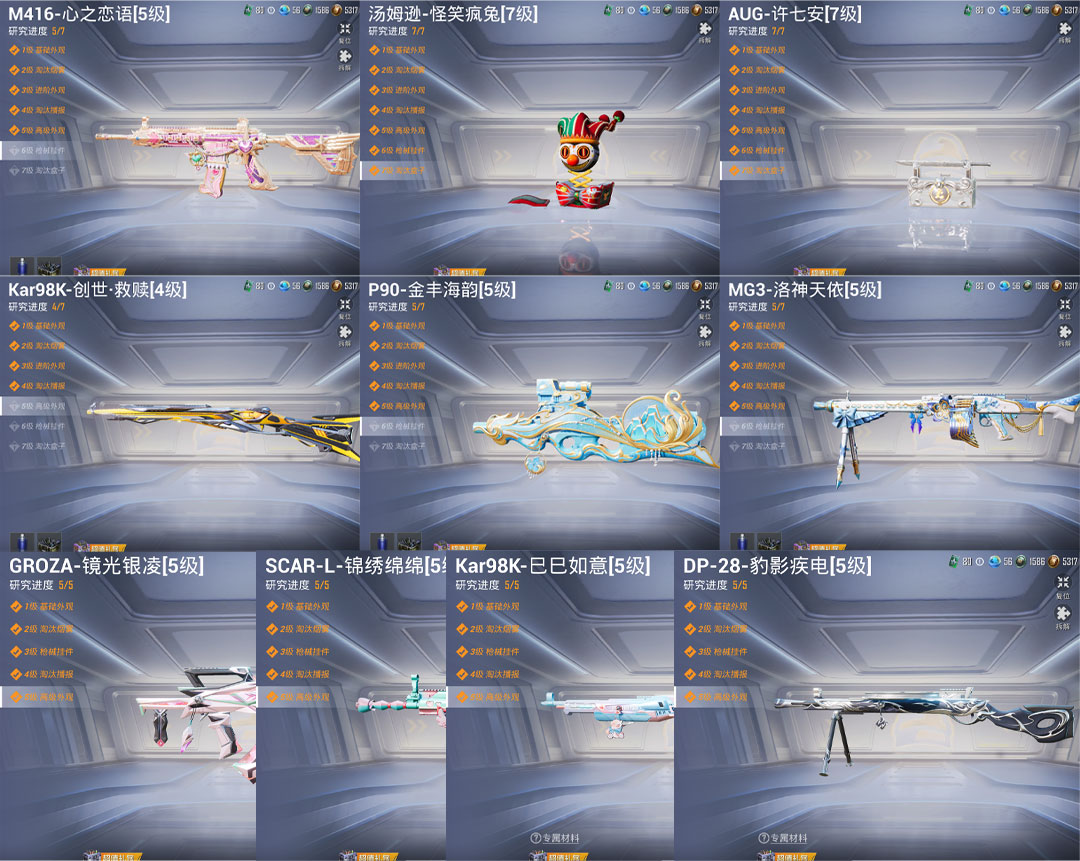 特效枪10:M416-心之恋语5级,汤姆逊-怪笑疯兔7级,MG3-洛神天依5级,SCAR-L-锦绣绵绵5级,kar98k-创世.就输4级,P90-金丰海韵5级,GROZA-镜光银凌5级 ,AUG-许七安7级,kar98k-巳巳如意5级,DP-28-豹影疾电5
