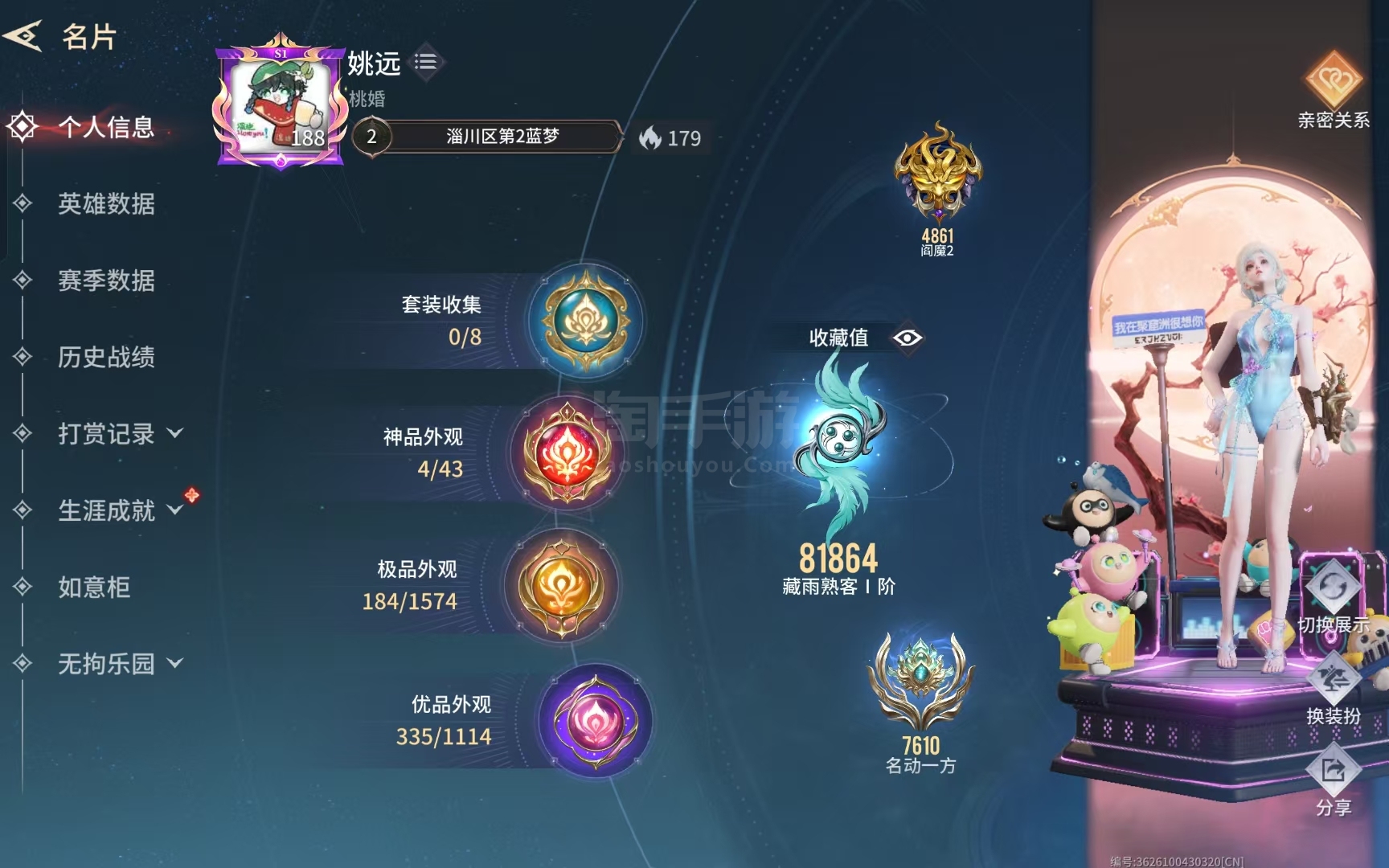 永劫无间手游【安卓官方】4红184金,双字ID:姚远S1赛季开服号最高罗刹段位,蓝梦泳装双火男胡桃红皮飞鼠钩锁等