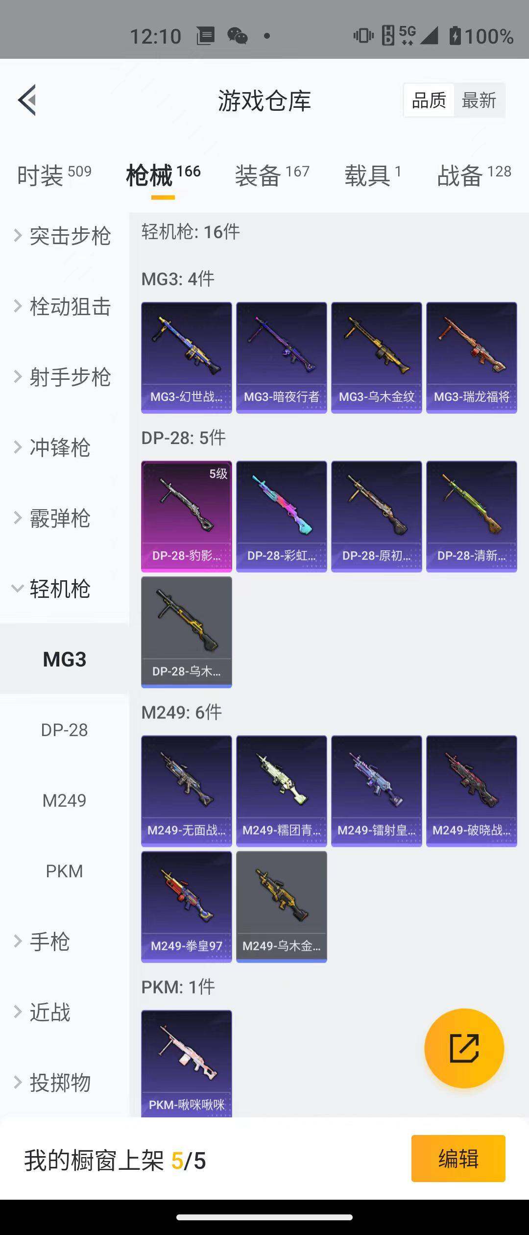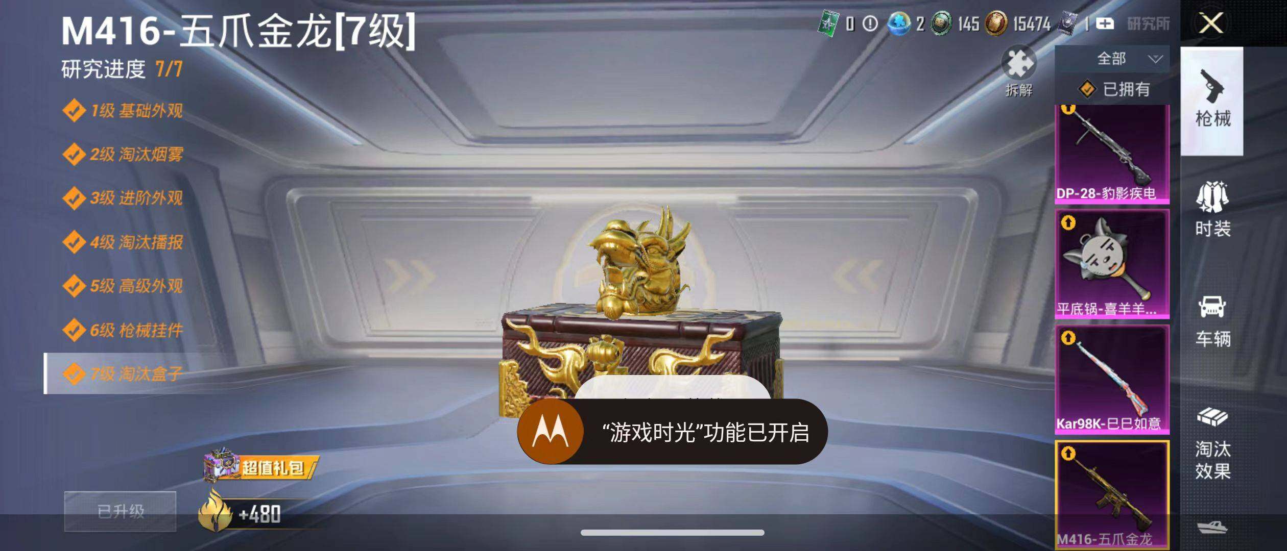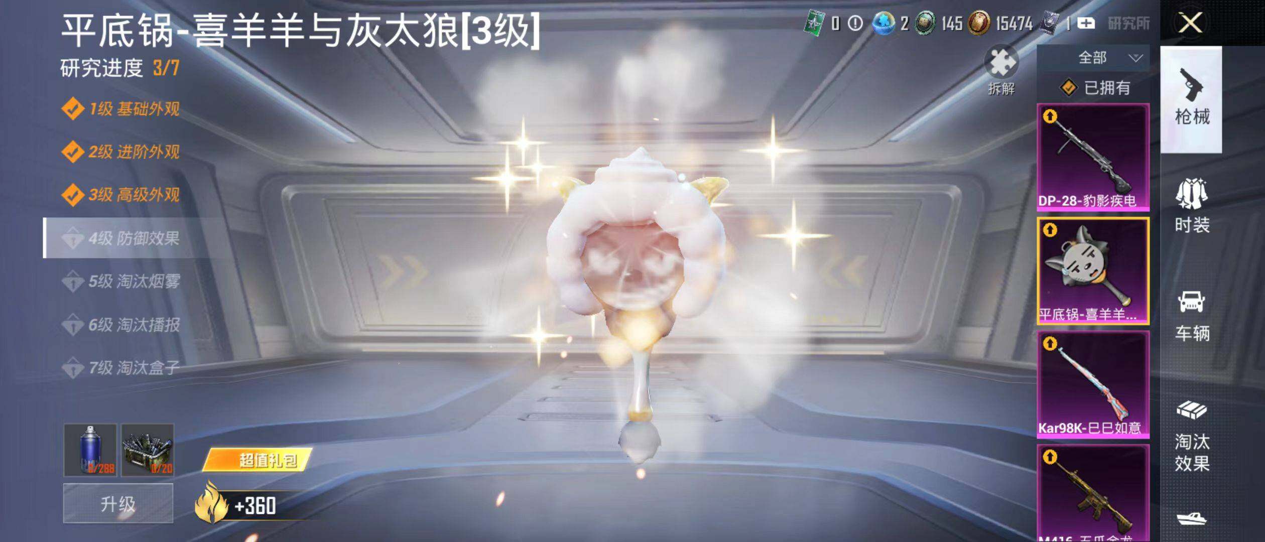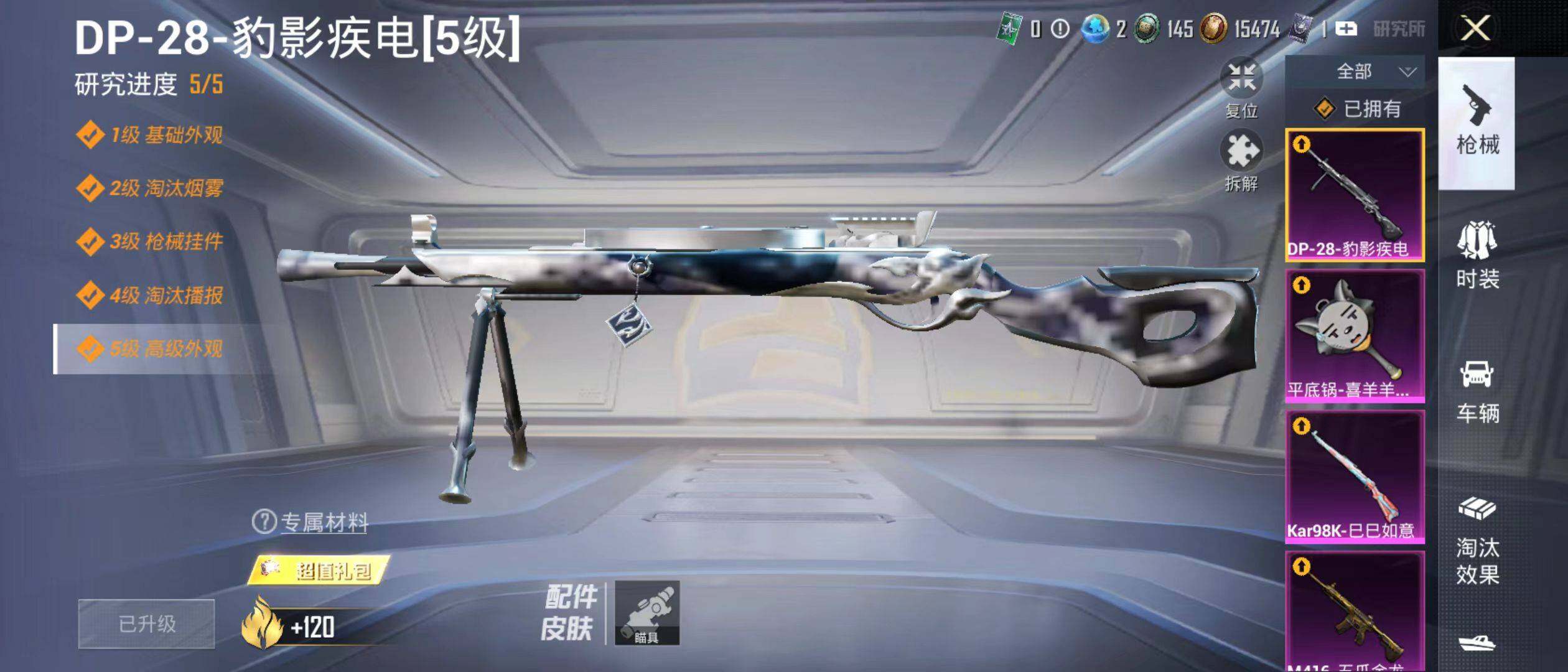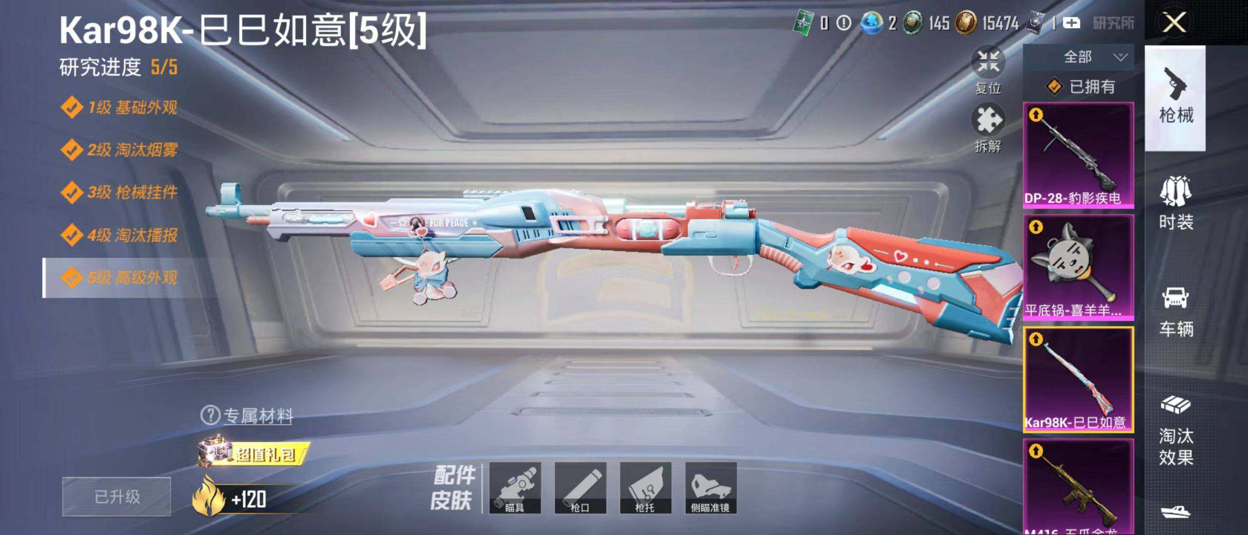 【粉色枪皮等级】:M416-五爪金龙(七级),Kar98K-巳巳如意(五级),DP-28-豹影疾电(五级),平底锅-喜羊羊与灰太狼(三级)