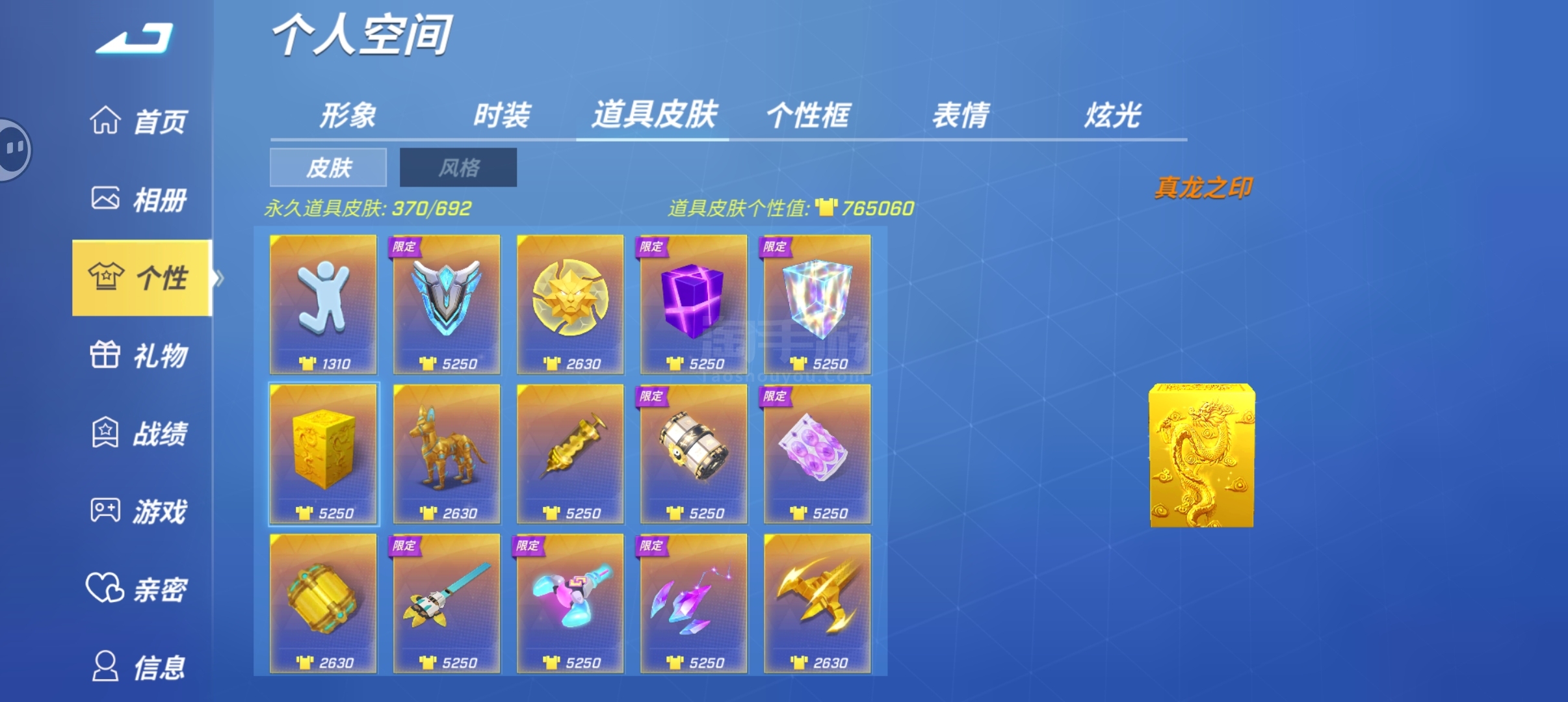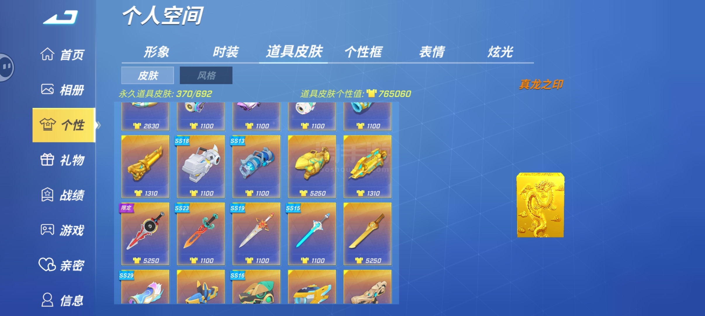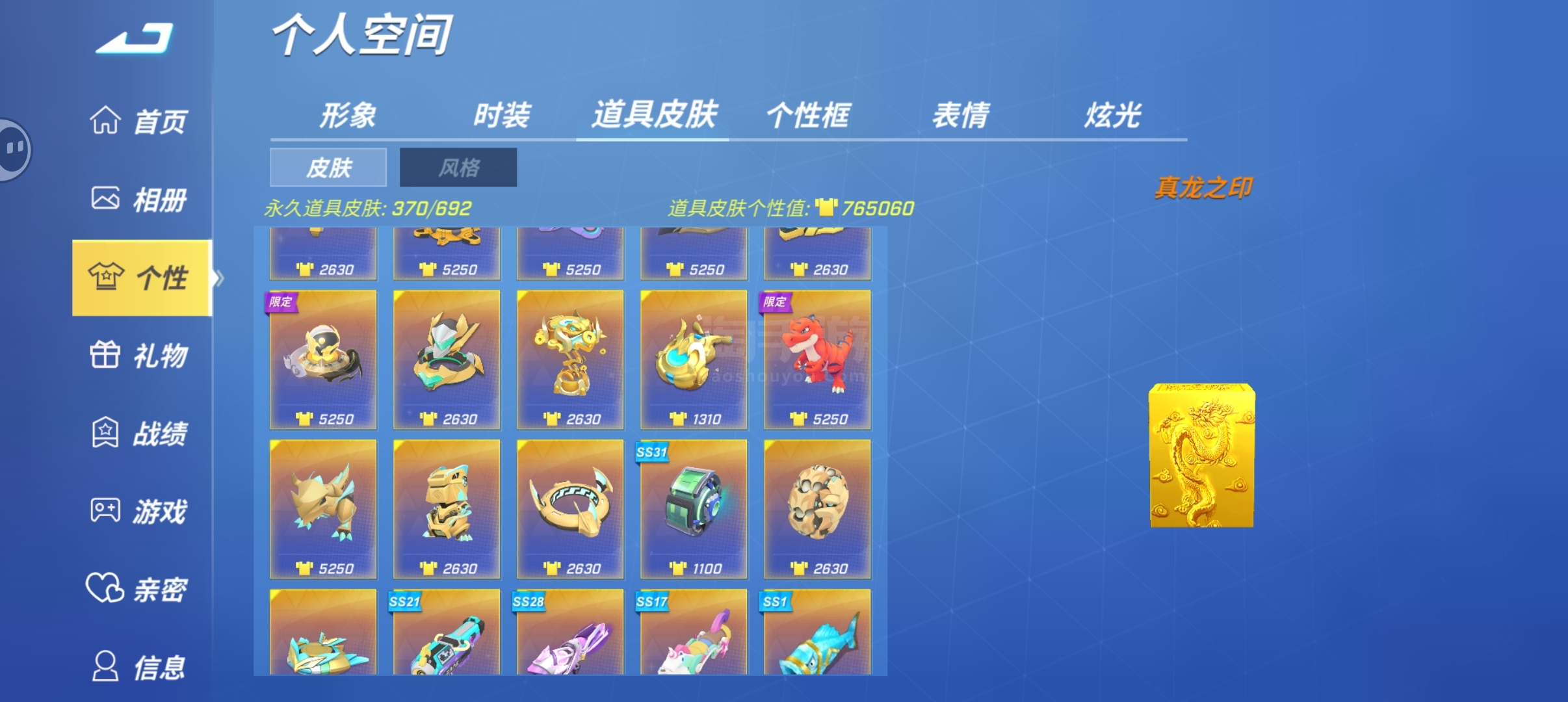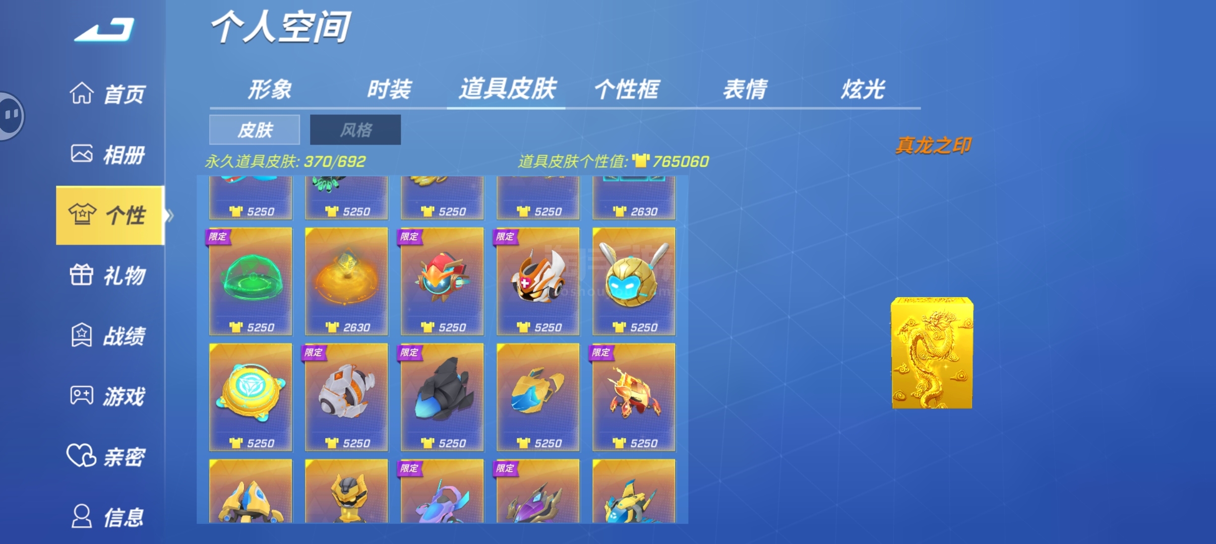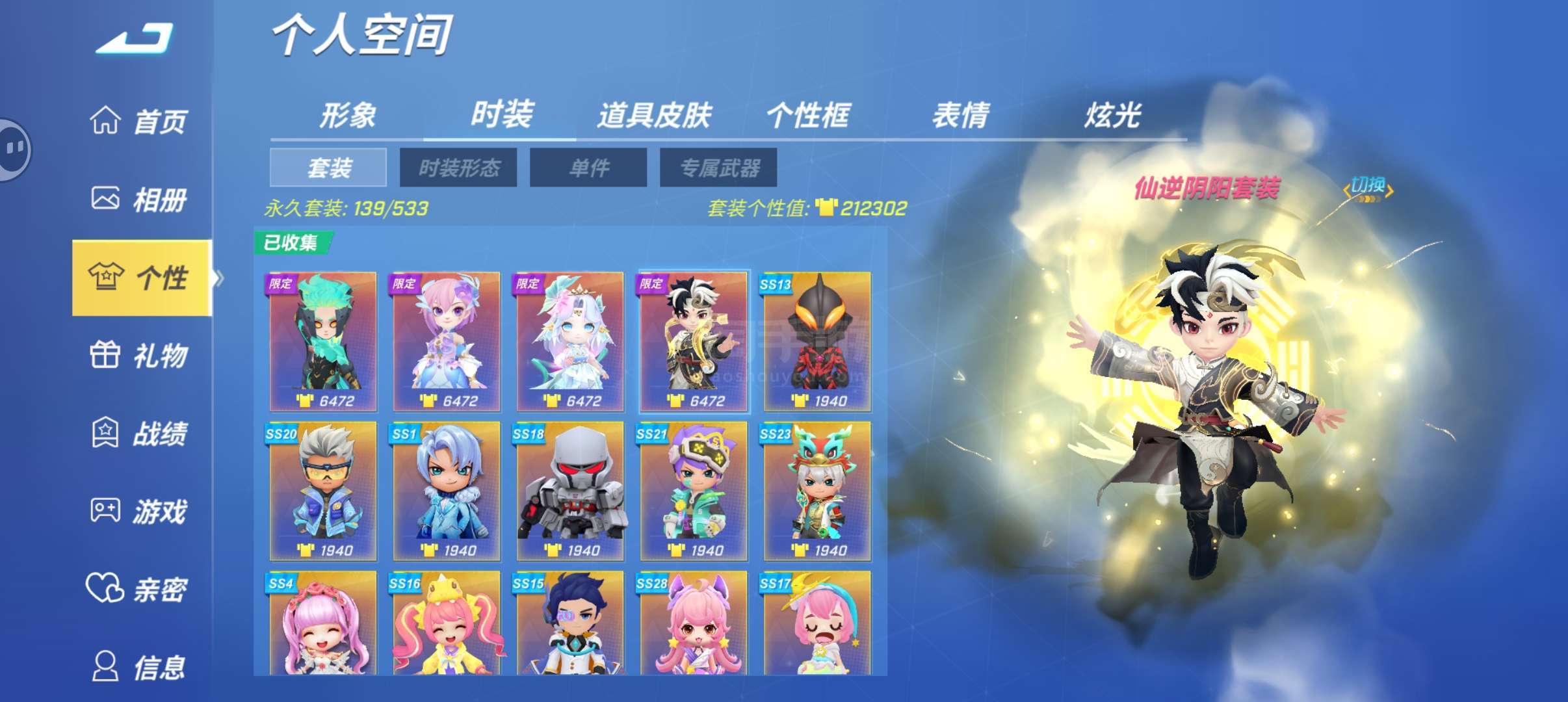 千星,133万个性值,上百个蓝紫卡包还有10万万能碎片未分解,8个星耀时装和道具皮肤百万白金币