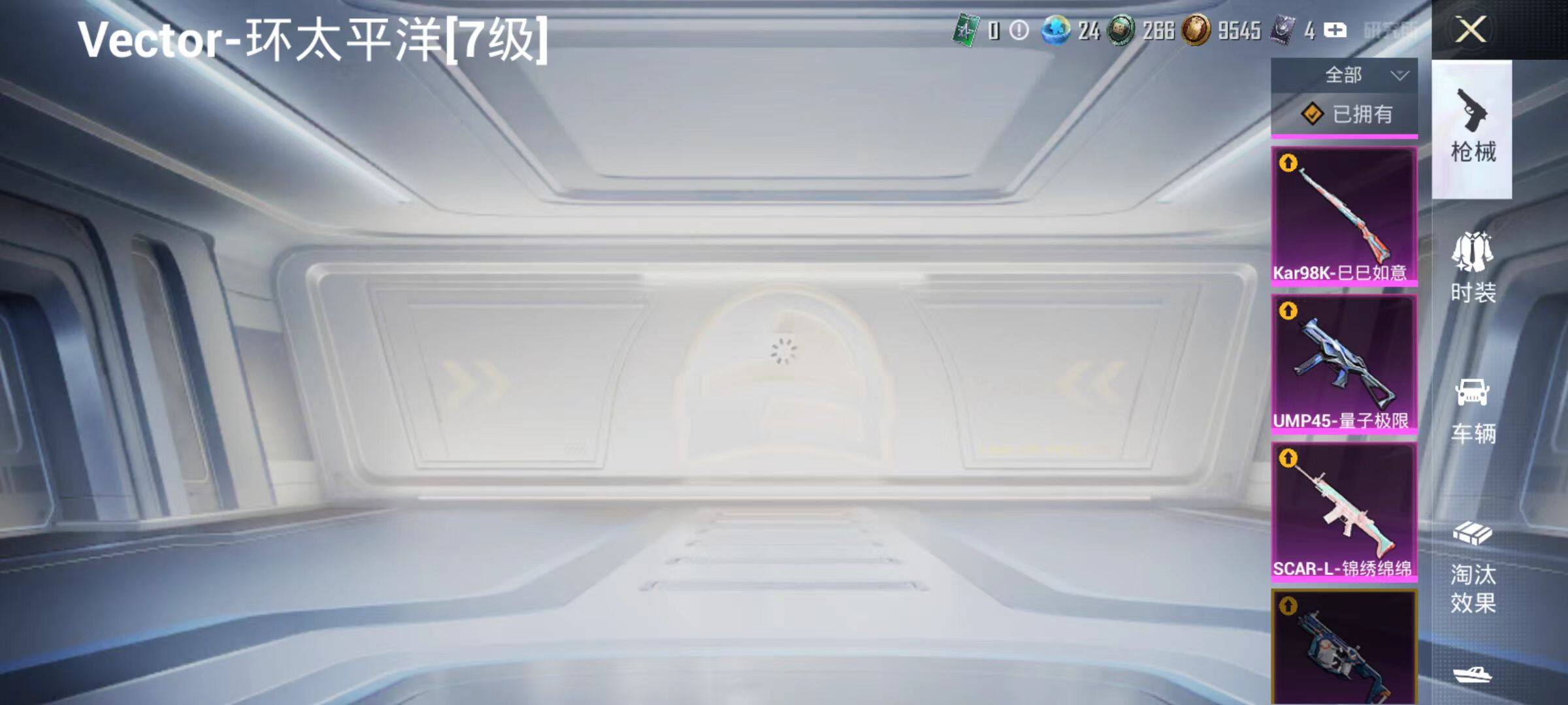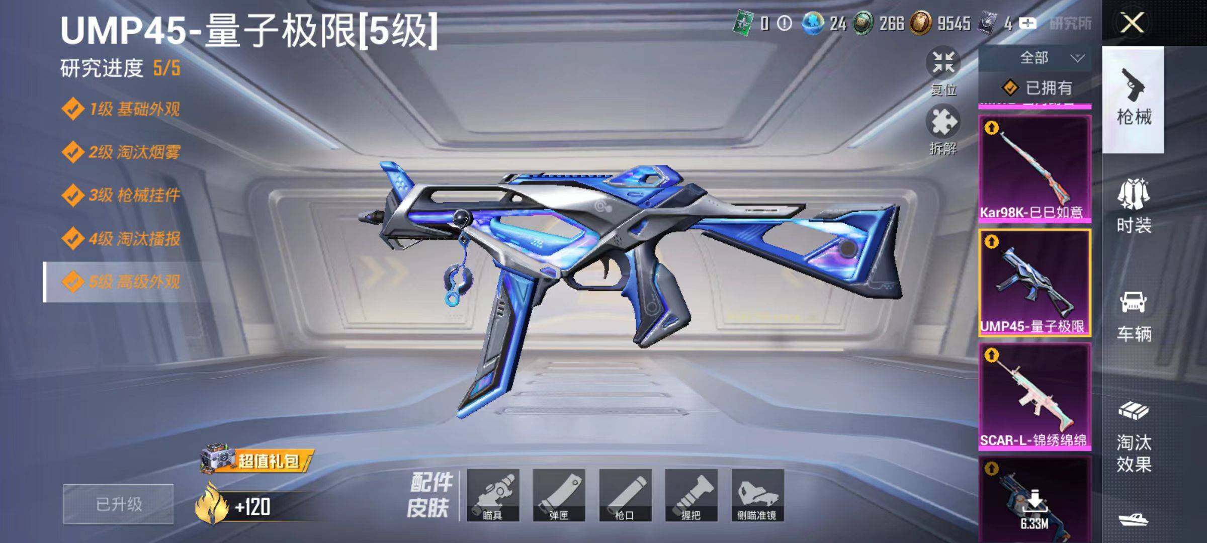 【粉色枪皮等级】:SCAR-L-锦绣绵绵(五级),UMP45-量子极限(五级),Vector-环太平洋(七级),Kar98K-巳巳如意(五级),MK12-雪月幻音(六级),DP-28-豹影疾电(一级)