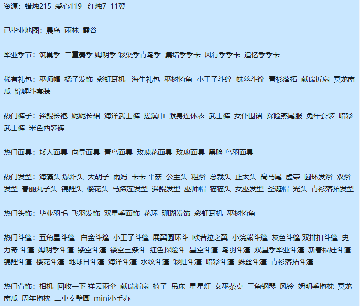 稀有礼包:巫师帽 橘子发饰 彩虹耳机 海牛礼包 巫树犄角 小王子斗篷 蛛丝斗篷 青衫落拓