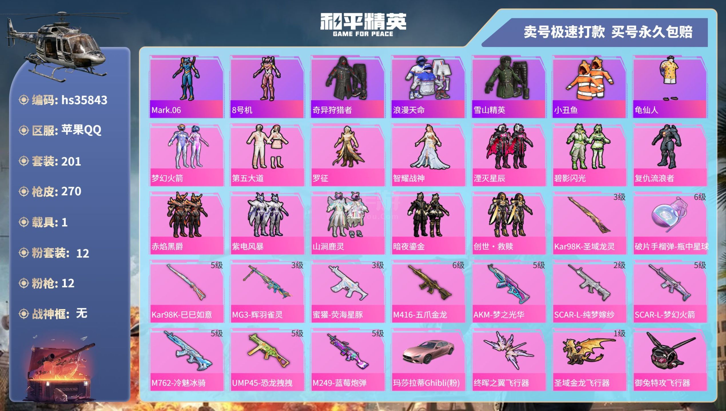 hs35843 苹果手Q-15王牌印记-12粉装-12特效枪-1载具-92009热力值-201套装-