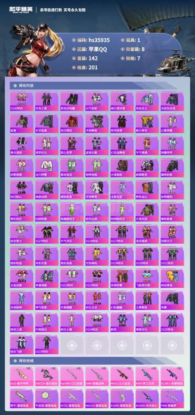 hs35935 苹果手Q-15王牌印记-8粉装-7特效枪-1载具-65441热力值-142套装-20