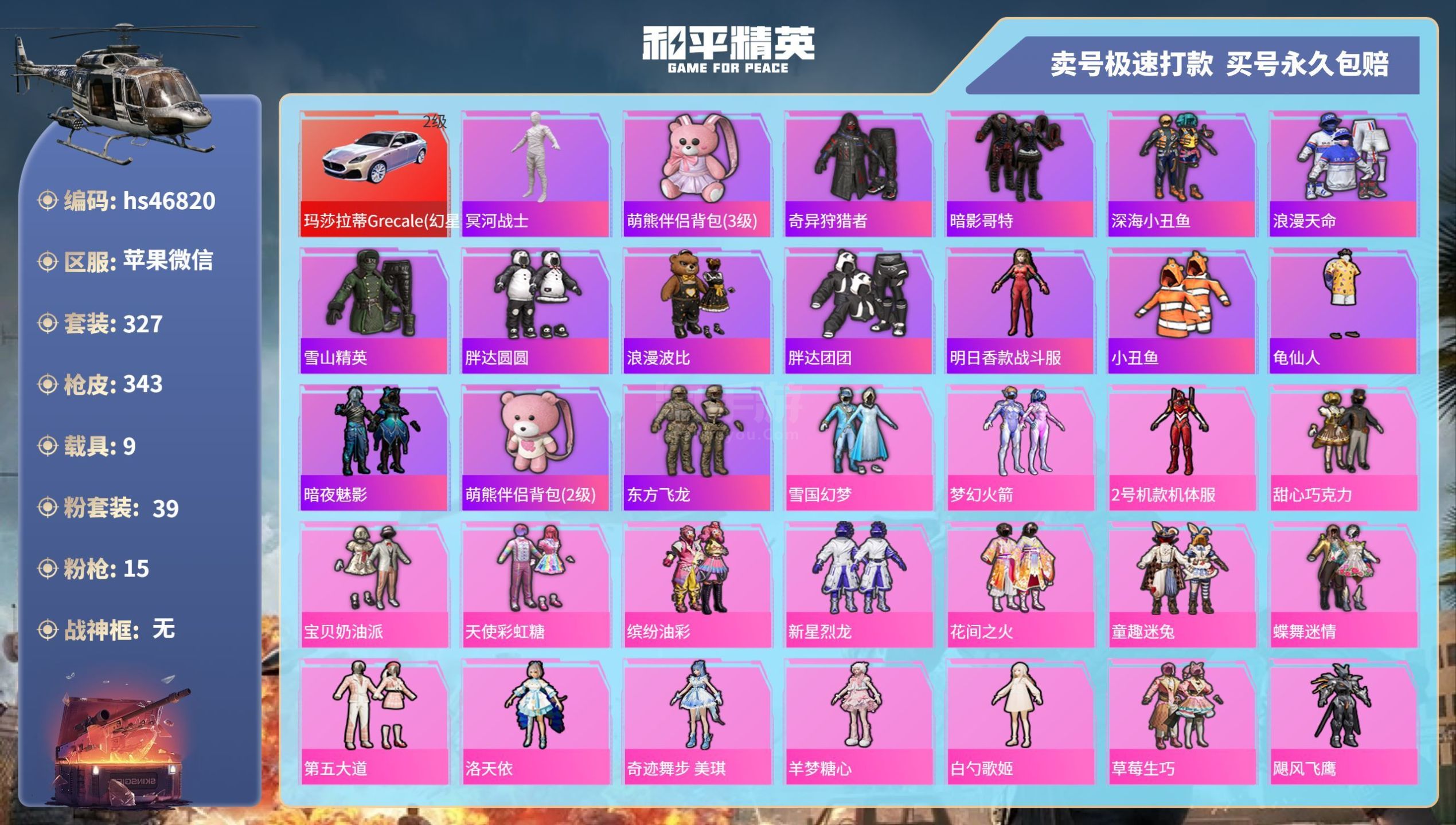 hs46820 苹果微-28王牌印记-39粉装-15特效枪-9载具-158941热力值-327套装