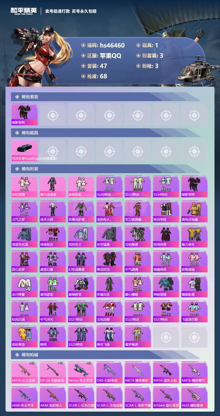 hs46460 苹果手Q-1王牌印记-3粉装-3特效枪-1载具-21355热力值-47套装-68枪皮