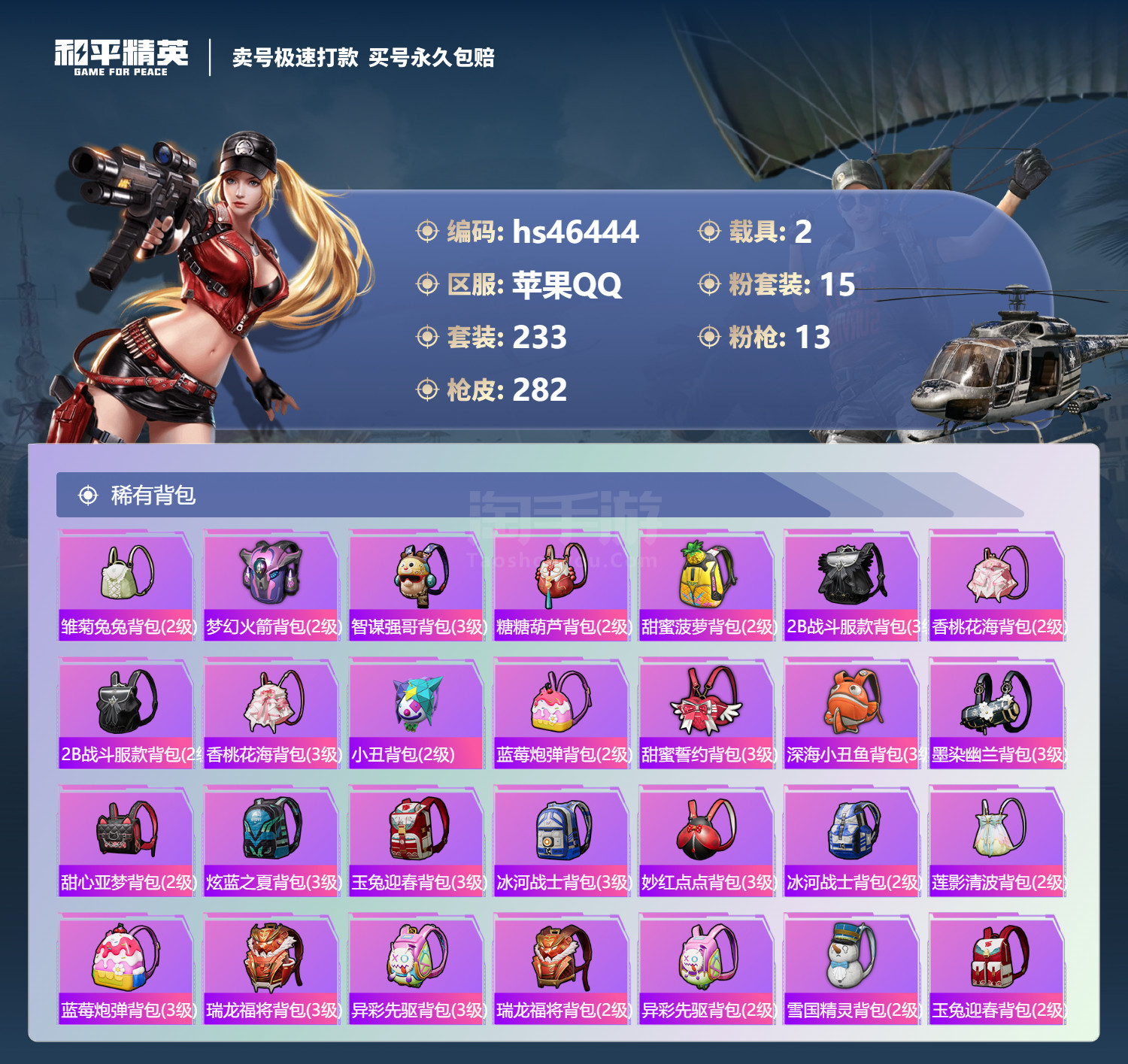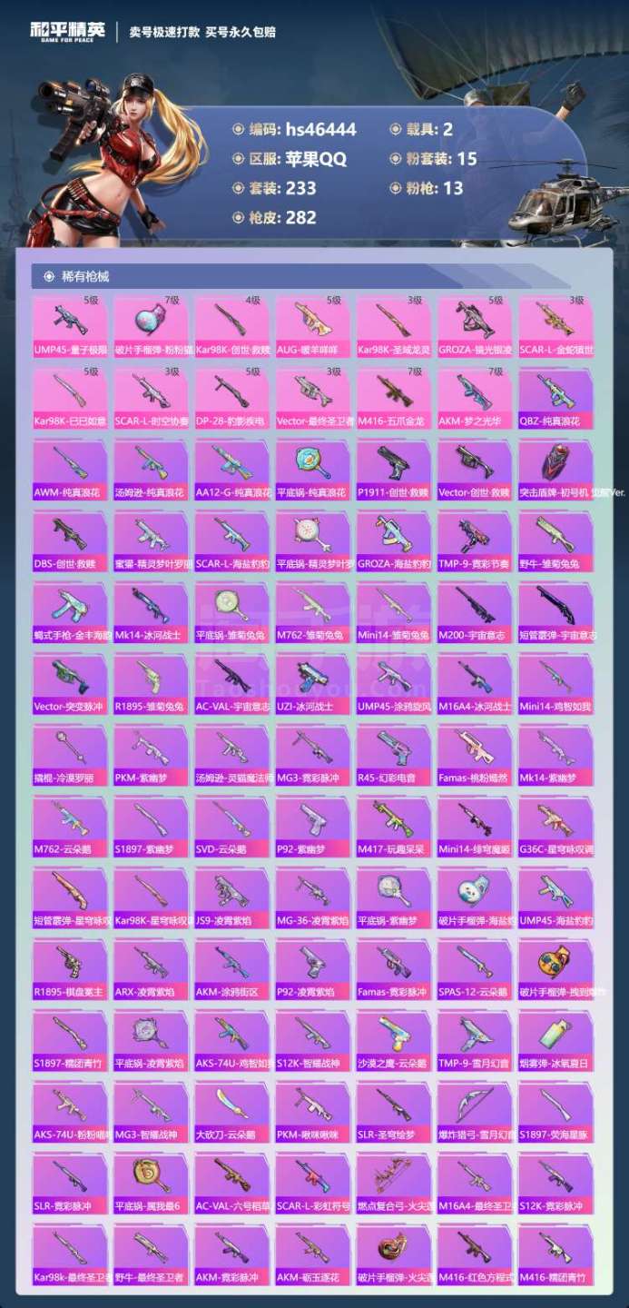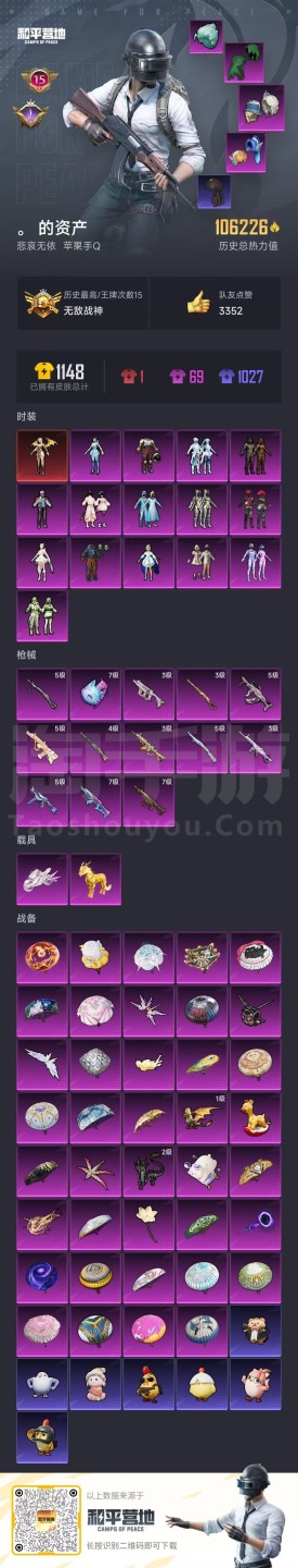 hs46444 苹果手Q-15王牌印记-有战神框-15粉装-13特效枪-2载具-106226热力值-