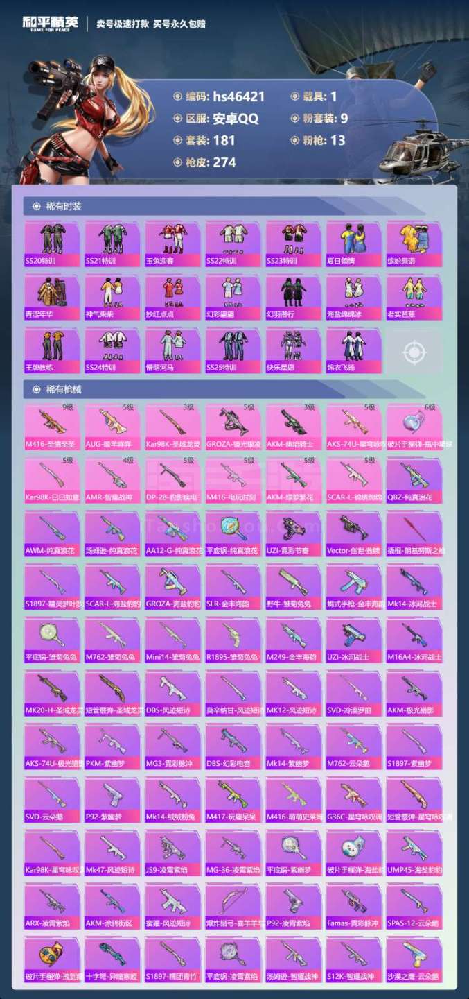 hs46421 安卓手Q-18王牌印记-有战神框-9粉装-13特效枪-1载具-90492热力值-18