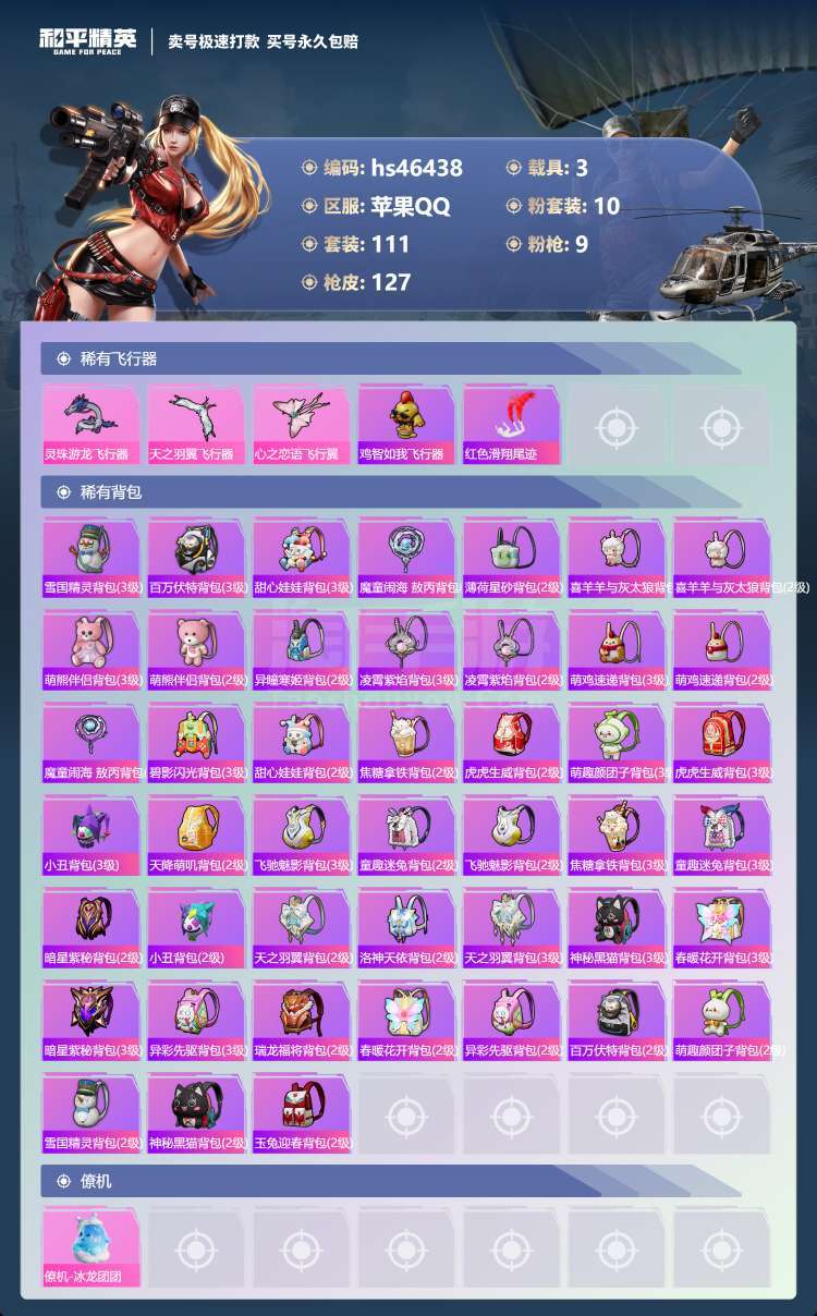 hs46438 苹果手Q-9王牌印记-10粉装-9特效枪-3载具-56097热力值-111套装-12
