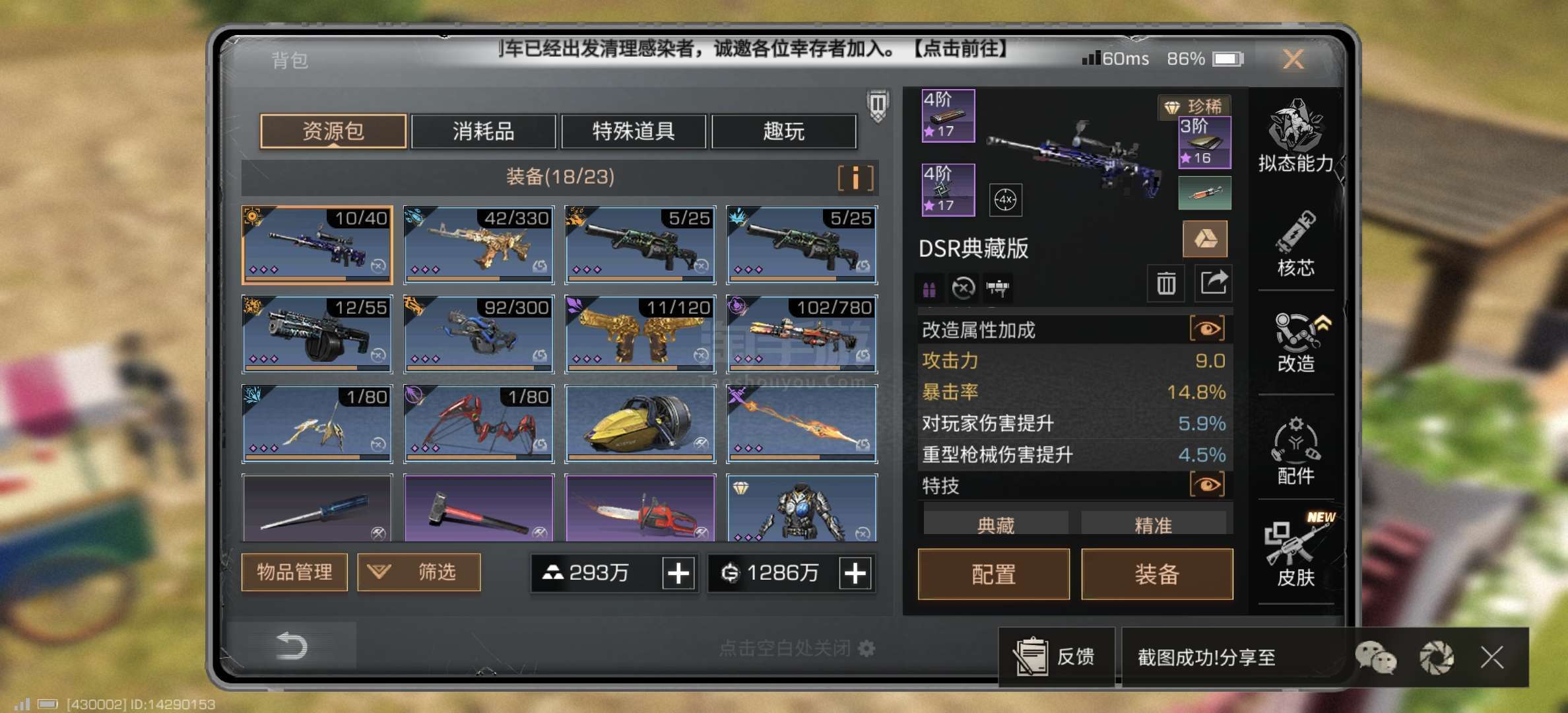 毕业狙,11个小号养大号,两个满级制作,有资源。两套装备,暴击,爆伤。
