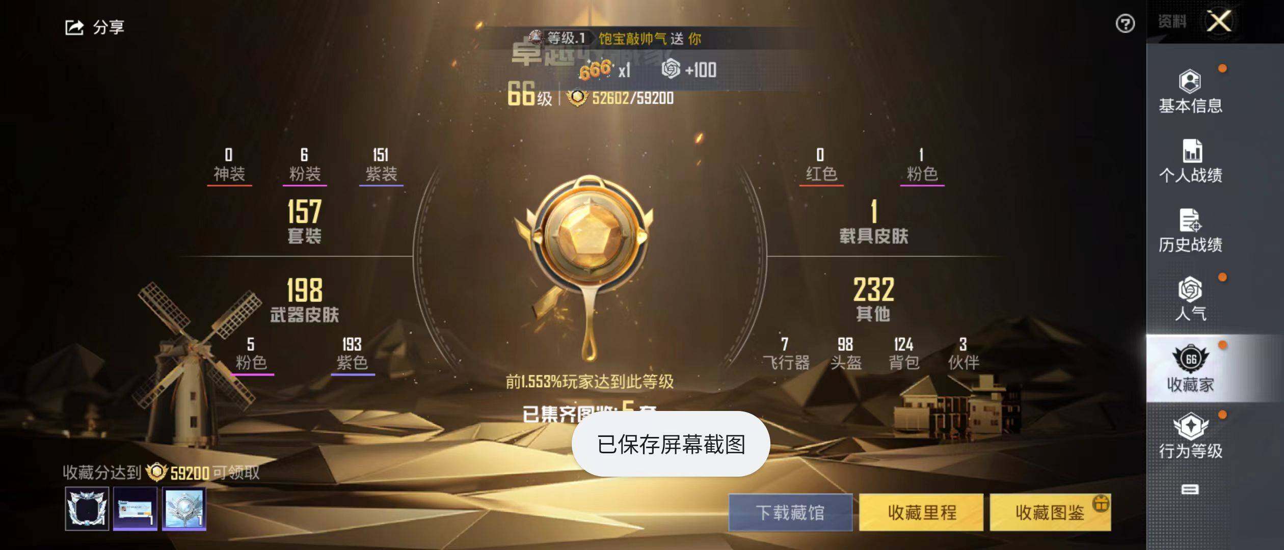 安卓 手Q-6粉装-5特效枪-1载具-2粉色飞行器-65061热力值-13王牌印记-157套装-214枪皮