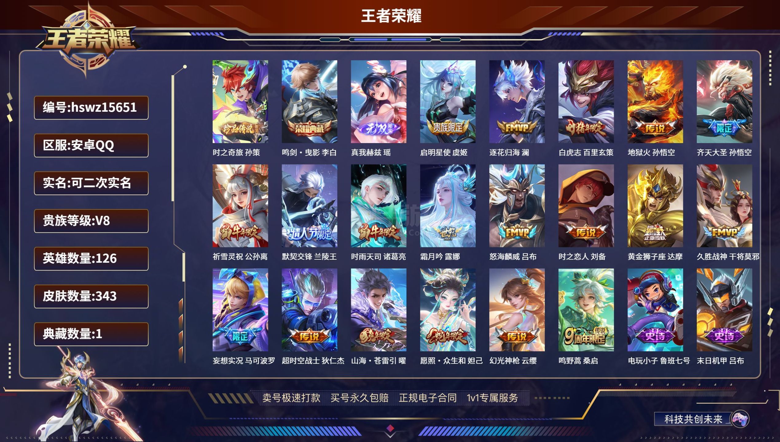 安卓QQ/永恒钻石/343皮肤/126英雄/1典藏/0珍品无双/1无双/1珍品传说/19传说/101