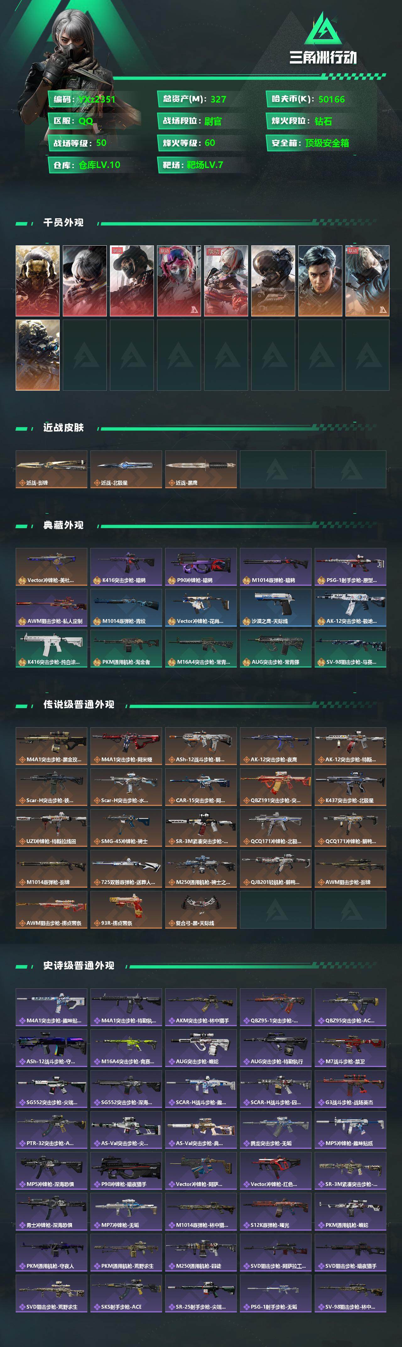 【店主强烈推荐-满红皮+两刀皮+1典藏枪皮+顶级安全箱9(3x3);蚀金玫瑰+水墨云图+黑·天际线+午夜邮差+维什戴尔;影锋+北极星;Vector冲锋枪-美杜莎优品B;威龙-飞虎】【Q区三端互通】【无二次】YXz2351-特勤处:仓库10级/靶场7级/训练中心7级-总资产327.9m-哈夫币5016w-烽火等级:60级【勾选了部分账号,详细看图,平台认证商家店铺,保证金商家,安全有保障,性价比超