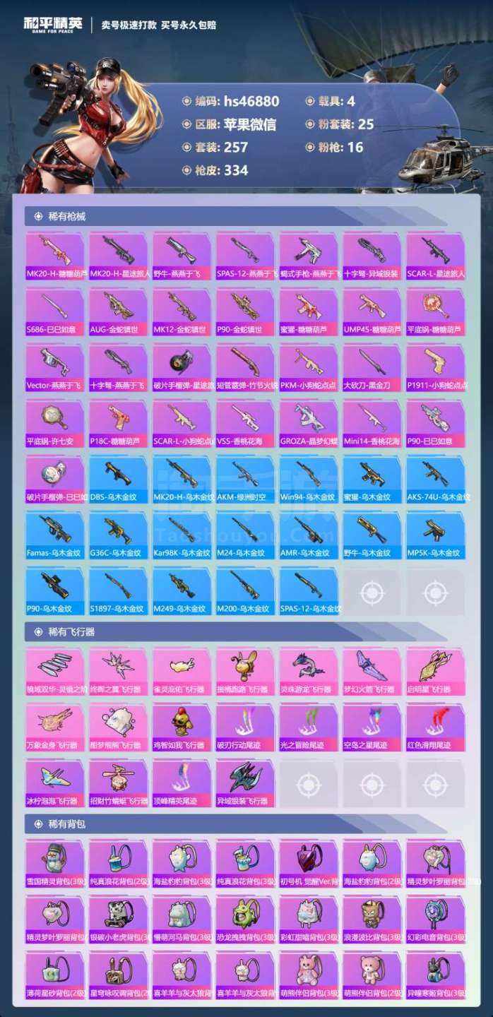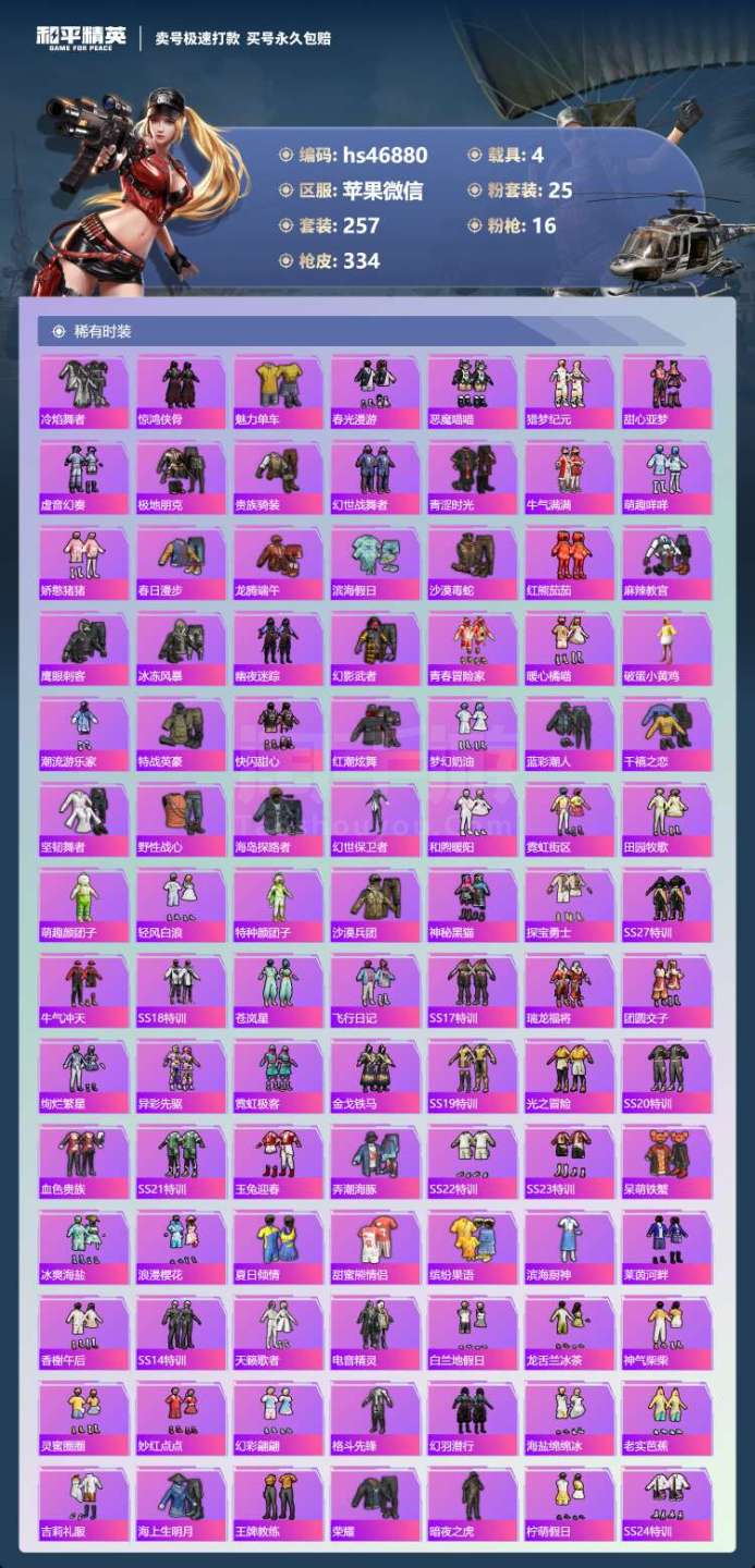 hs46880 苹果微-20王牌印记-有战神框-25粉装-16特效枪-4载具-121023热力值-