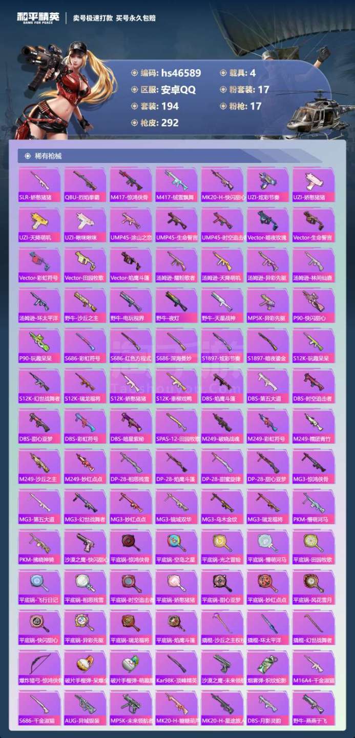 hs46589 安卓手Q-17王牌印记-17粉装-17特效枪-4载具-108833热力值-194套装
