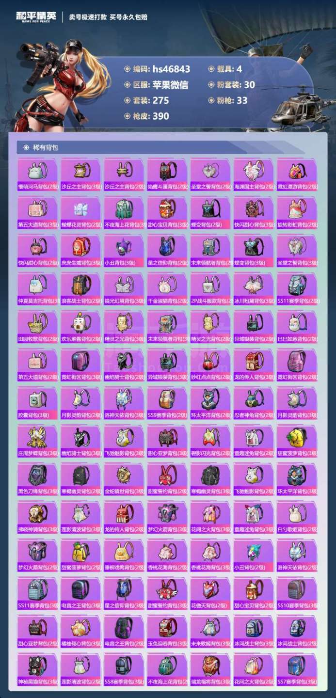 hs46843 苹果微-21王牌印记-有战神框-30粉装-33特效枪-4载具-144139热力值-
