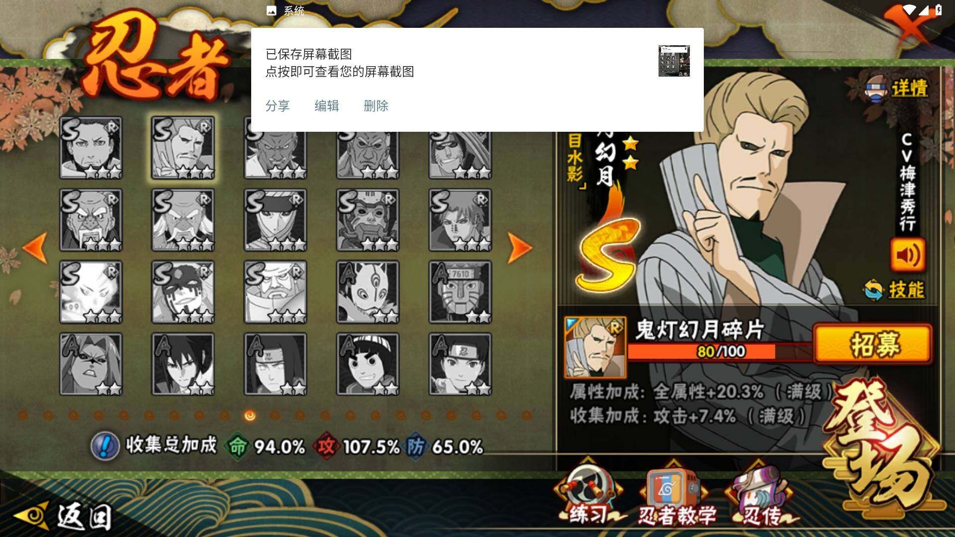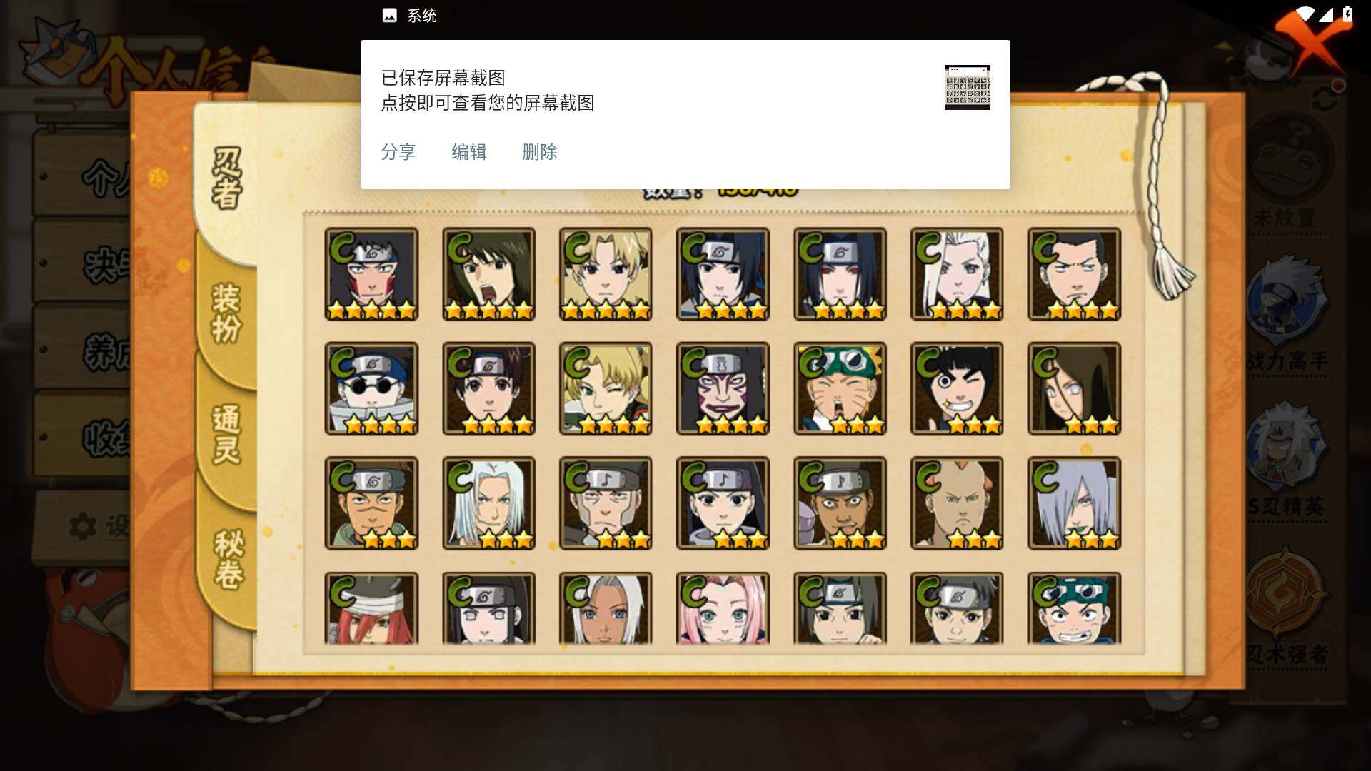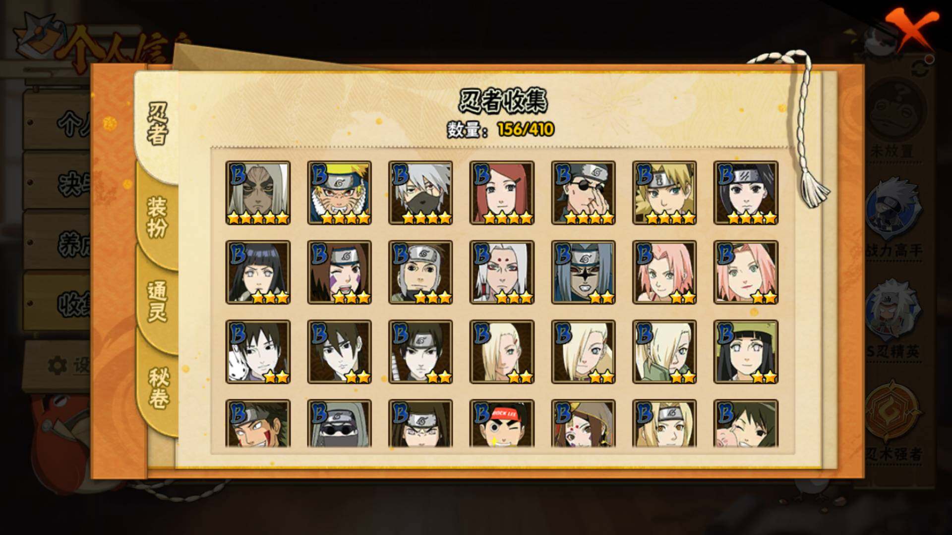 【S级忍者】:长门「秽土转生」(3星),猿飞日斩「秽土转生」(3星),波风水门「秽土转生」(3星),千手扉间「秽土转生」(3星),宇智波斑「秽土转生·解」(3星),宇智波鼬「须佐能乎」(4星),艾「四代目雷影」(3星),自来也「