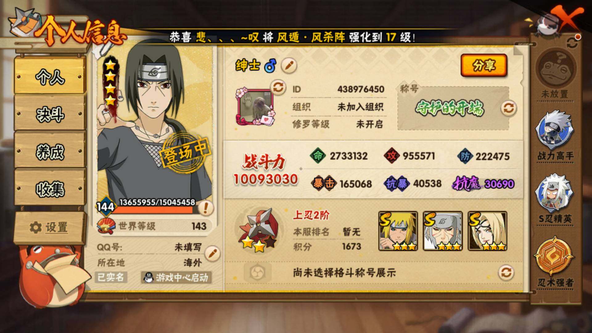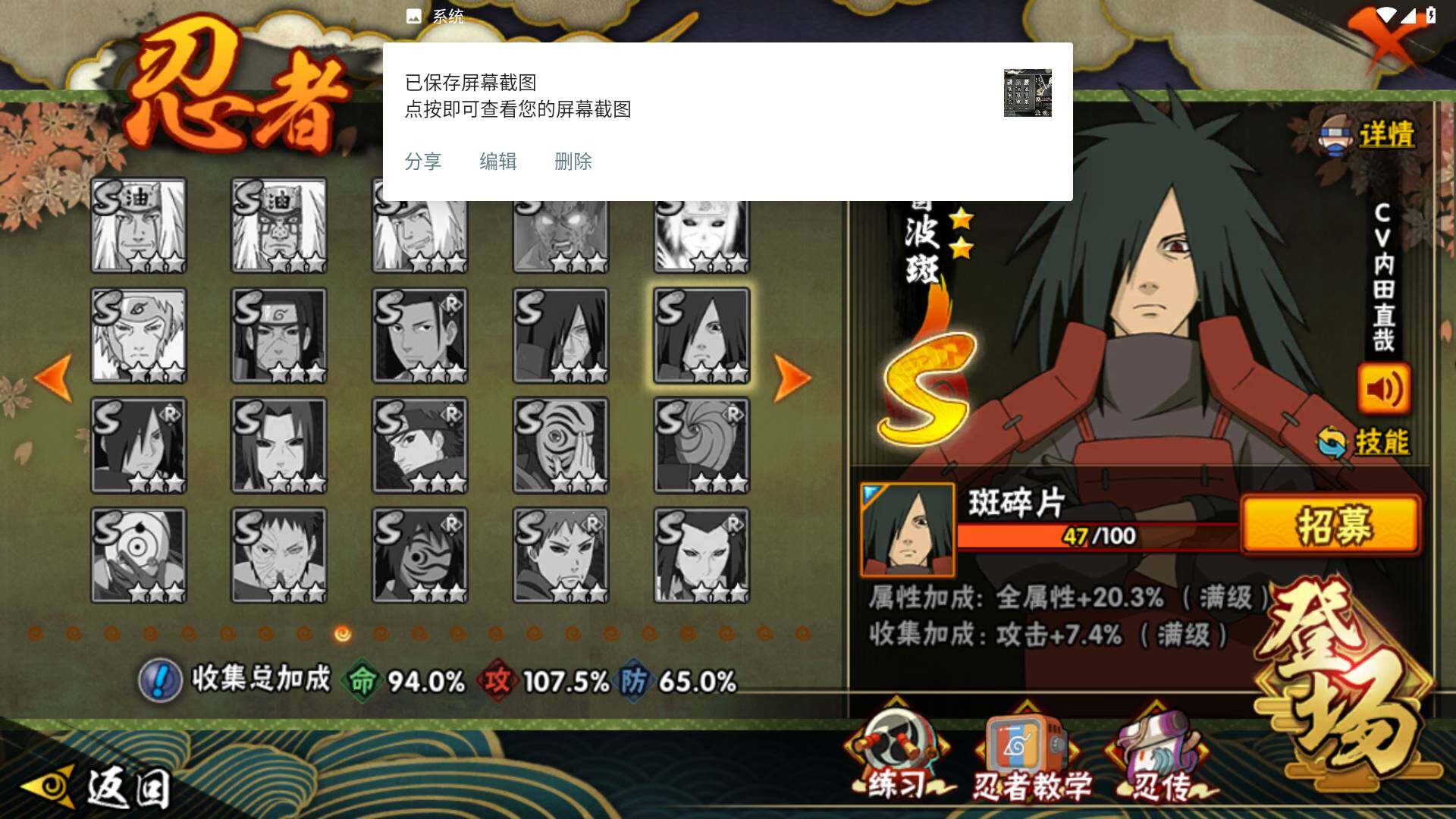 v7 17S 27A 1009万战力 648奥义图9(火影之道) 大野木49片 鬼灯幻月80片 斑47片 白面具47片 九喇嘛水门60片 仙人自来也58片 zp3185