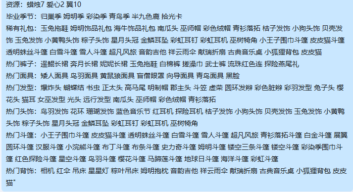 稀有礼包:玉兔拖鞋 姆明饰品礼包 海牛饰品礼包 南瓜头 巫师帽 彩色绒帽 青衫落拓 桔子发饰 小狗头饰 贝壳发饰 玉兔发饰 小黄鸭头饰 粽子
