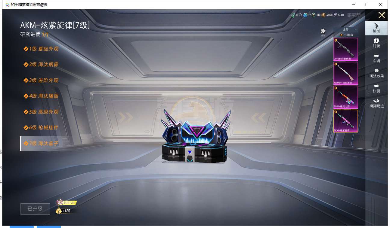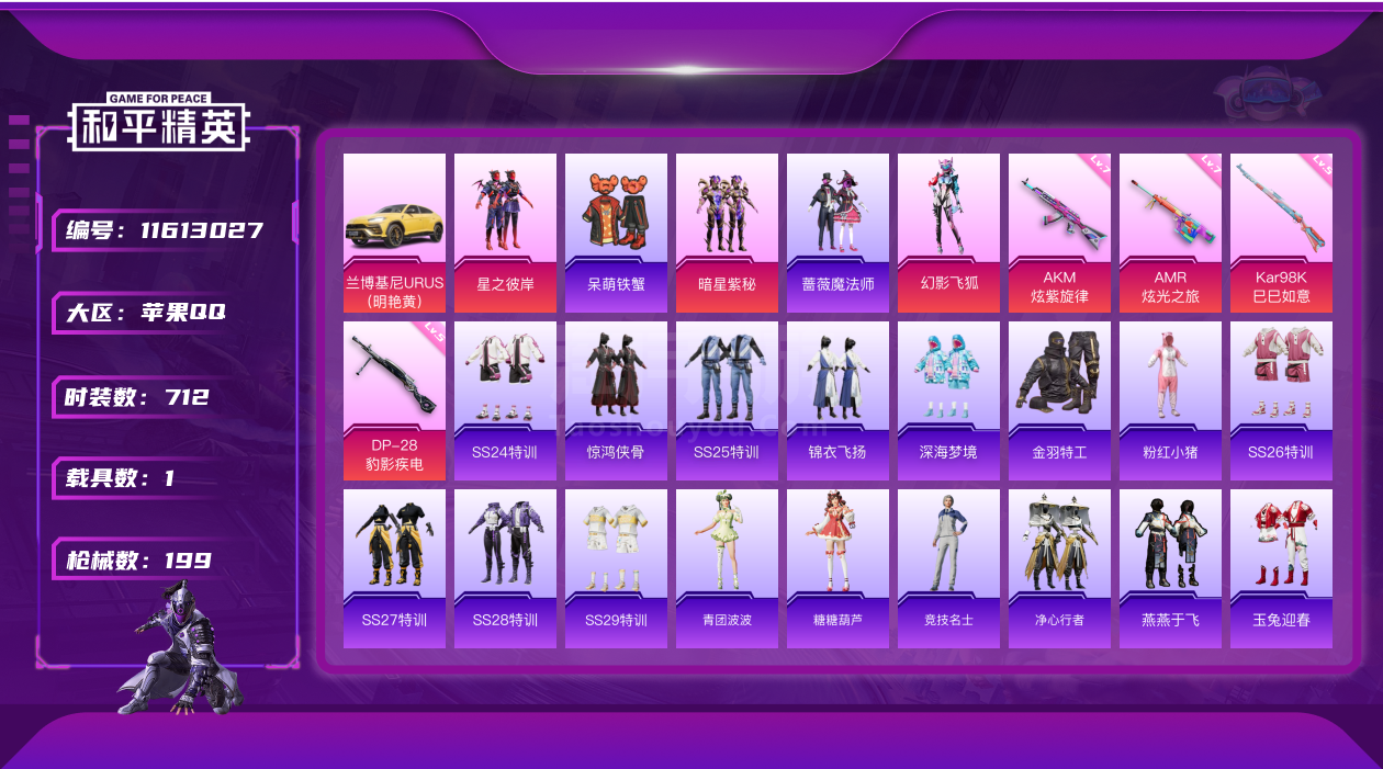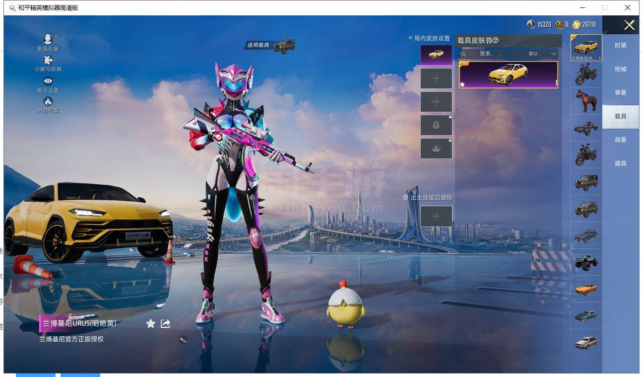热力值64935 1载具 3粉 4特效枪 兰博基尼URUS(明艳黄) 满级满配AKM-炫紫旋律 满级