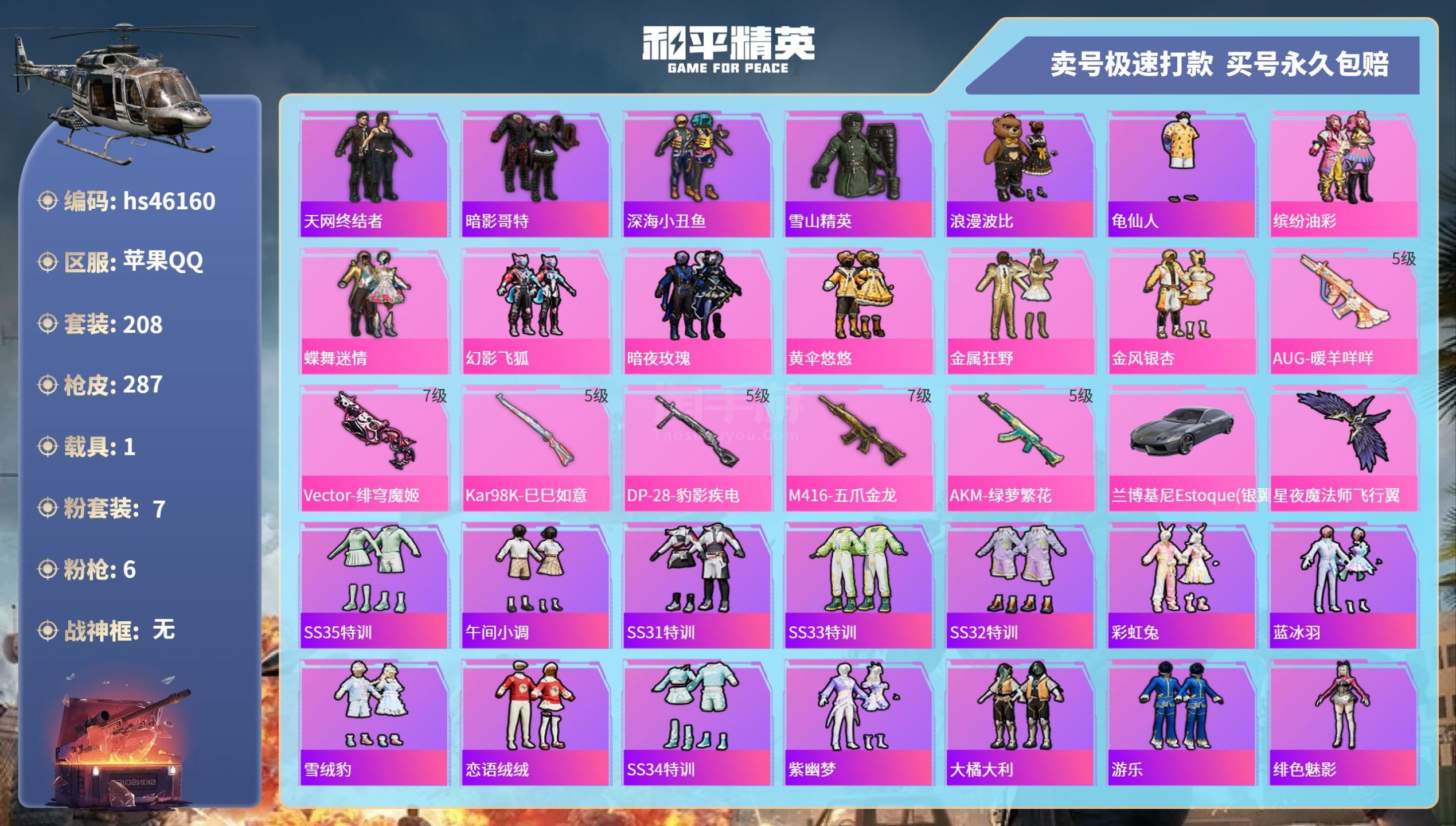 hs46160 苹果手Q-17王牌印记-7粉装-6特效枪-1载具-81310热力值-208套装-28