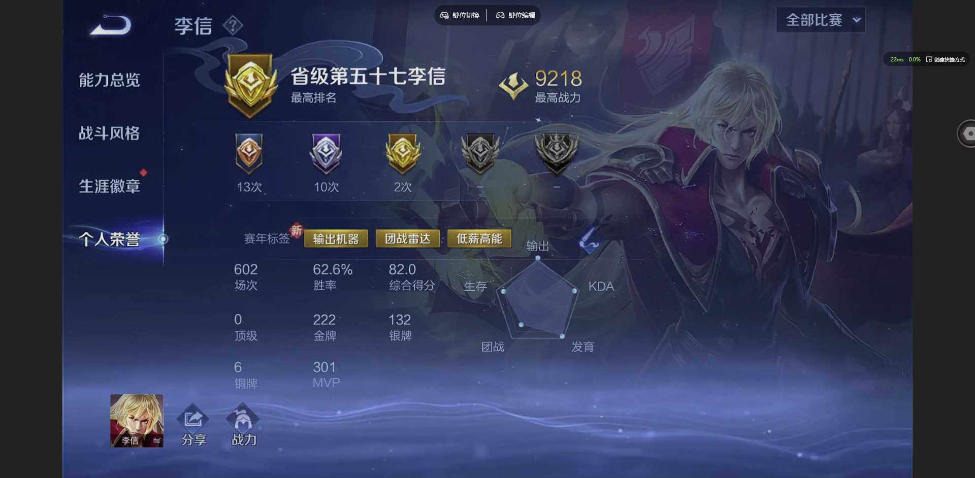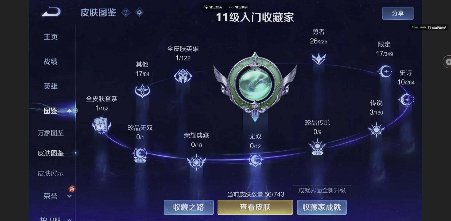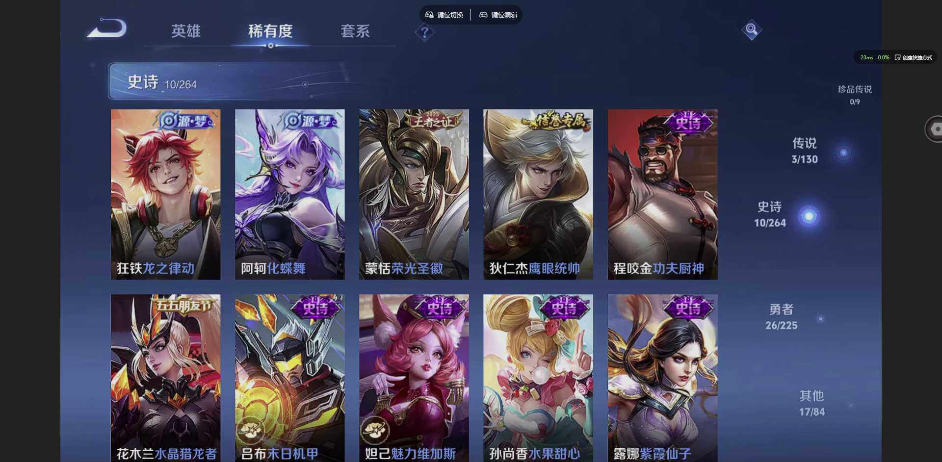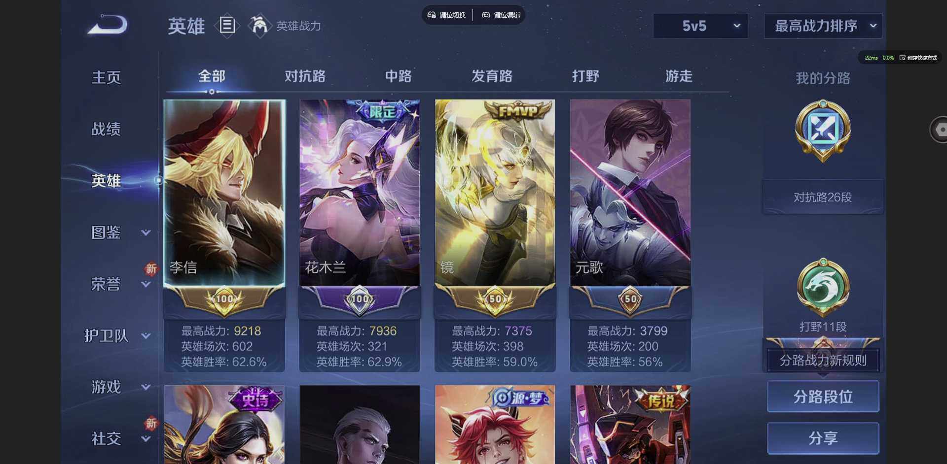 【金标李信 金标镜】贵族等级: V4 英雄数: 94 皮肤数: 56 传说皮: