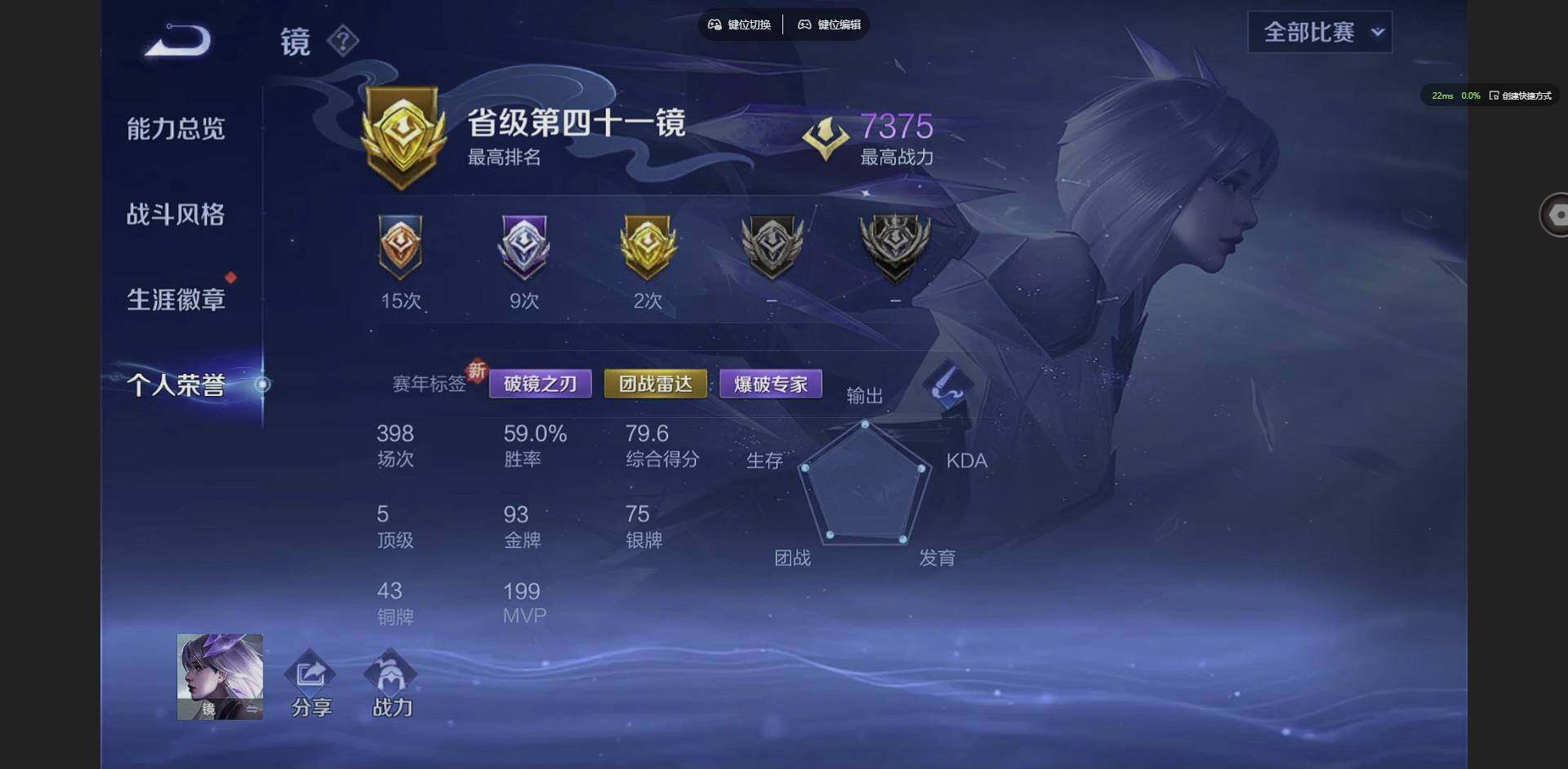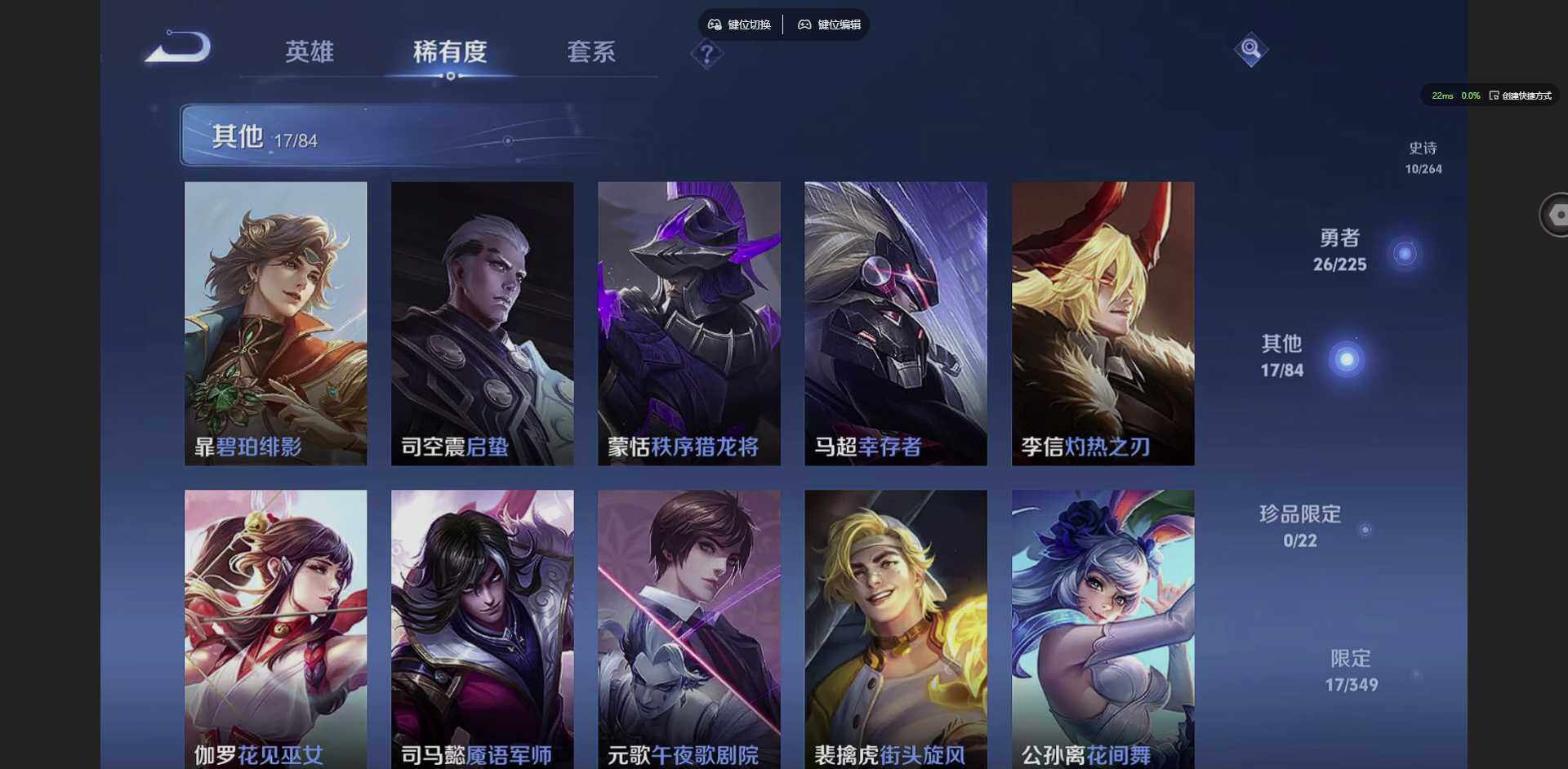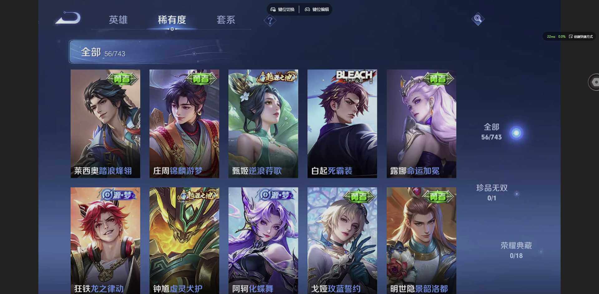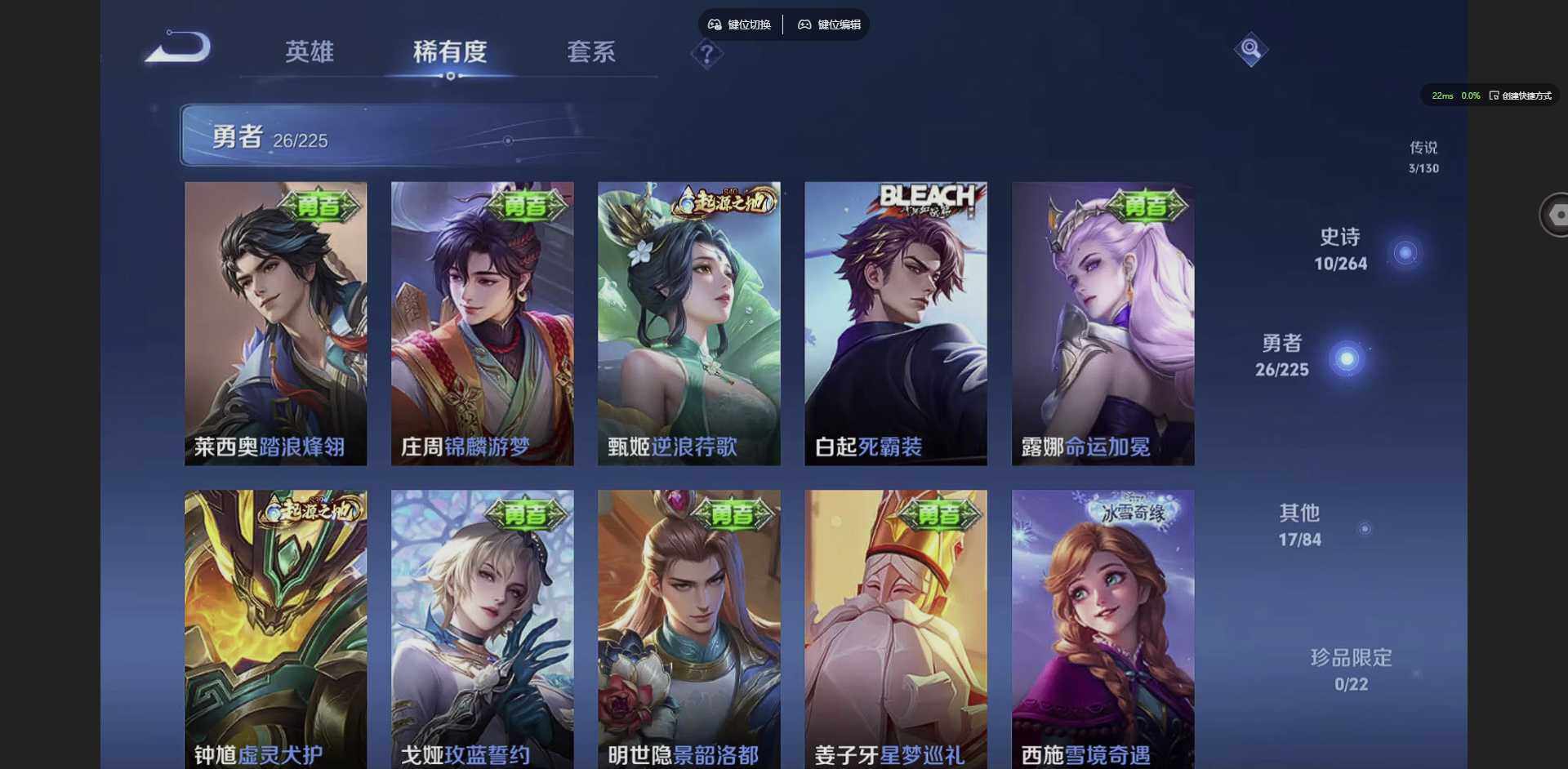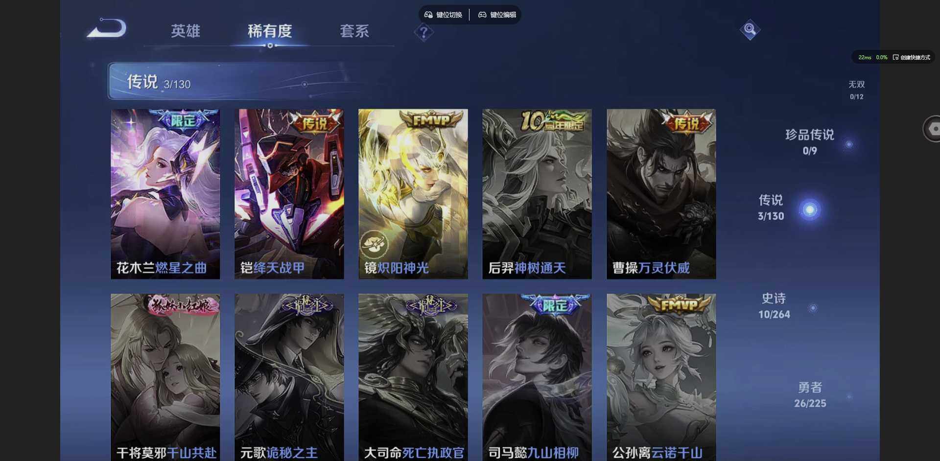 【金标李信 金标镜】贵族等级: V4 英雄数: 94 皮肤数: 56 传说皮:
