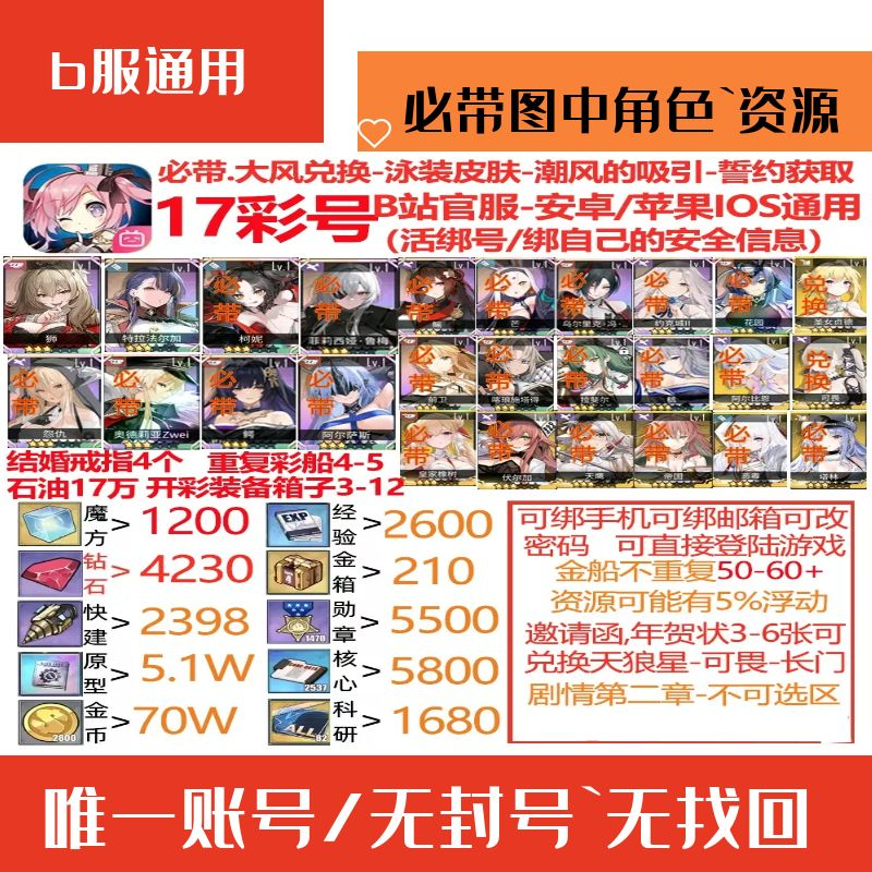 碧蓝航线【全服通用】【活绑】17彩号/4230红钻-1200魔方-2398块键