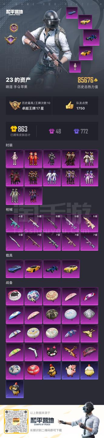 hs46700 苹果手Q-10王牌印记-12粉装-10特效枪-4载具-85676热力值-168套装-