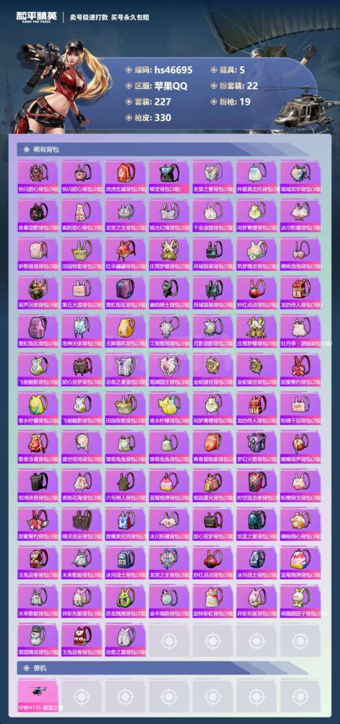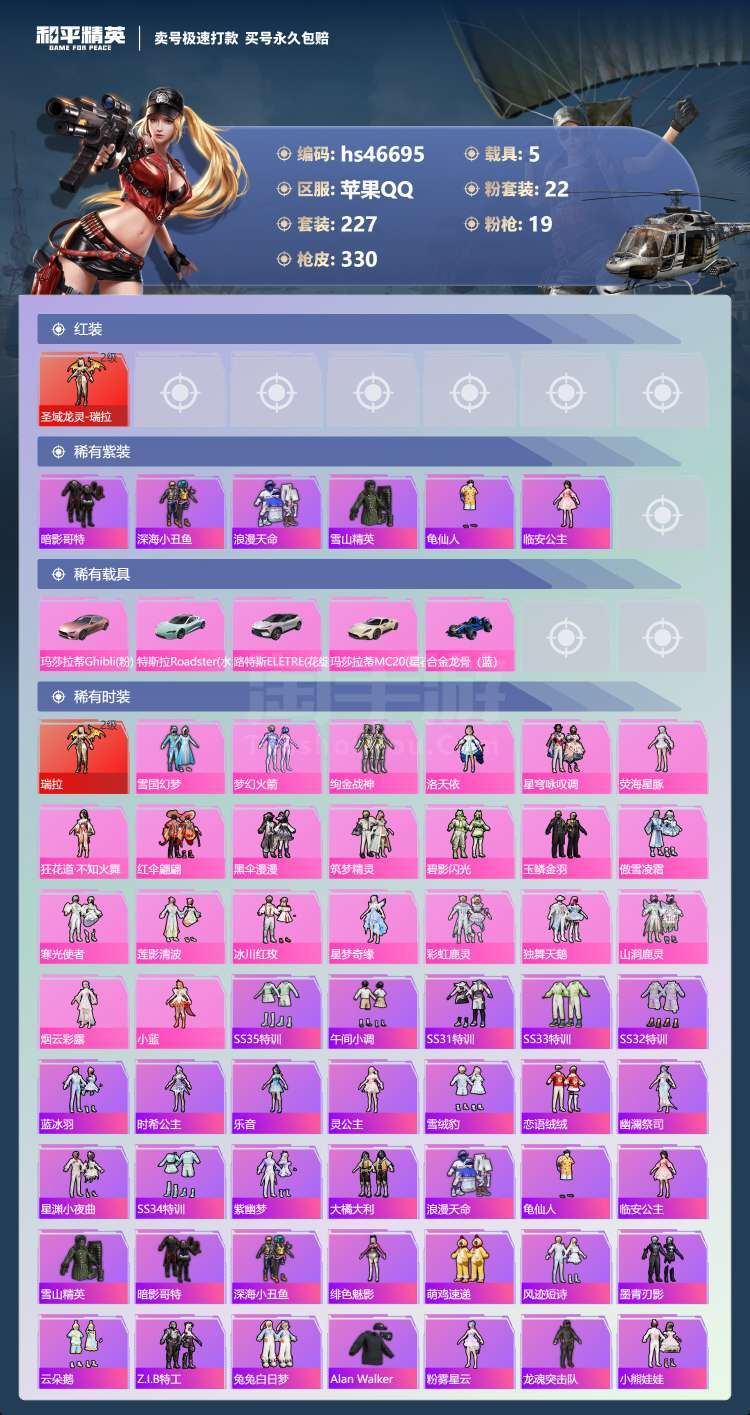 hs46695 苹果手Q-20王牌印记-22粉装-19特效枪-5载具-125395热力值-227套装
