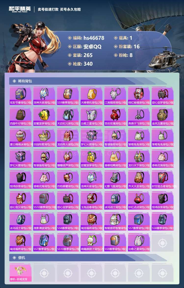 hs46678 安卓手Q-17王牌印记-16粉装-8特效枪-1载具-129360热力值-265套装-
