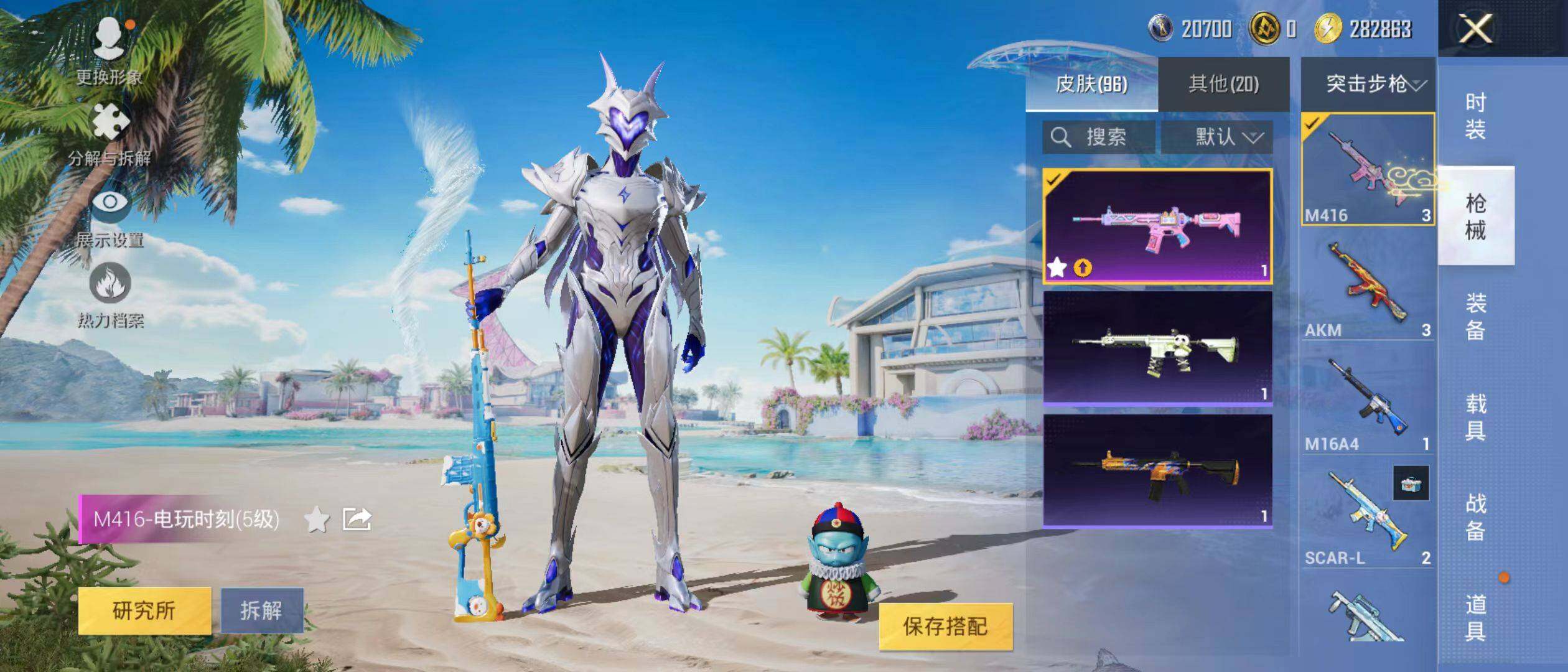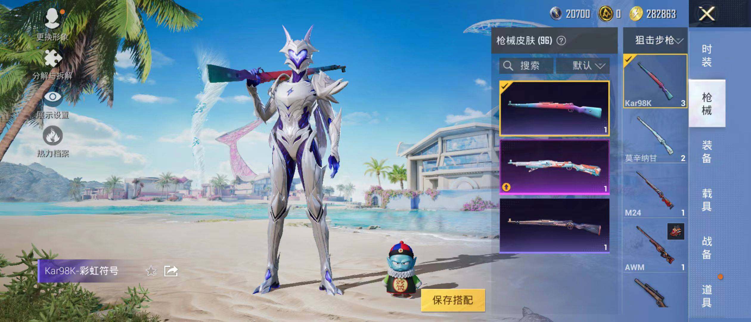 【特效枪等级】:M416-电玩时刻(五级),Kar98K-巳巳如意(五级),MG3-辉羽雀灵(五级Mk14-甜梦熊击)