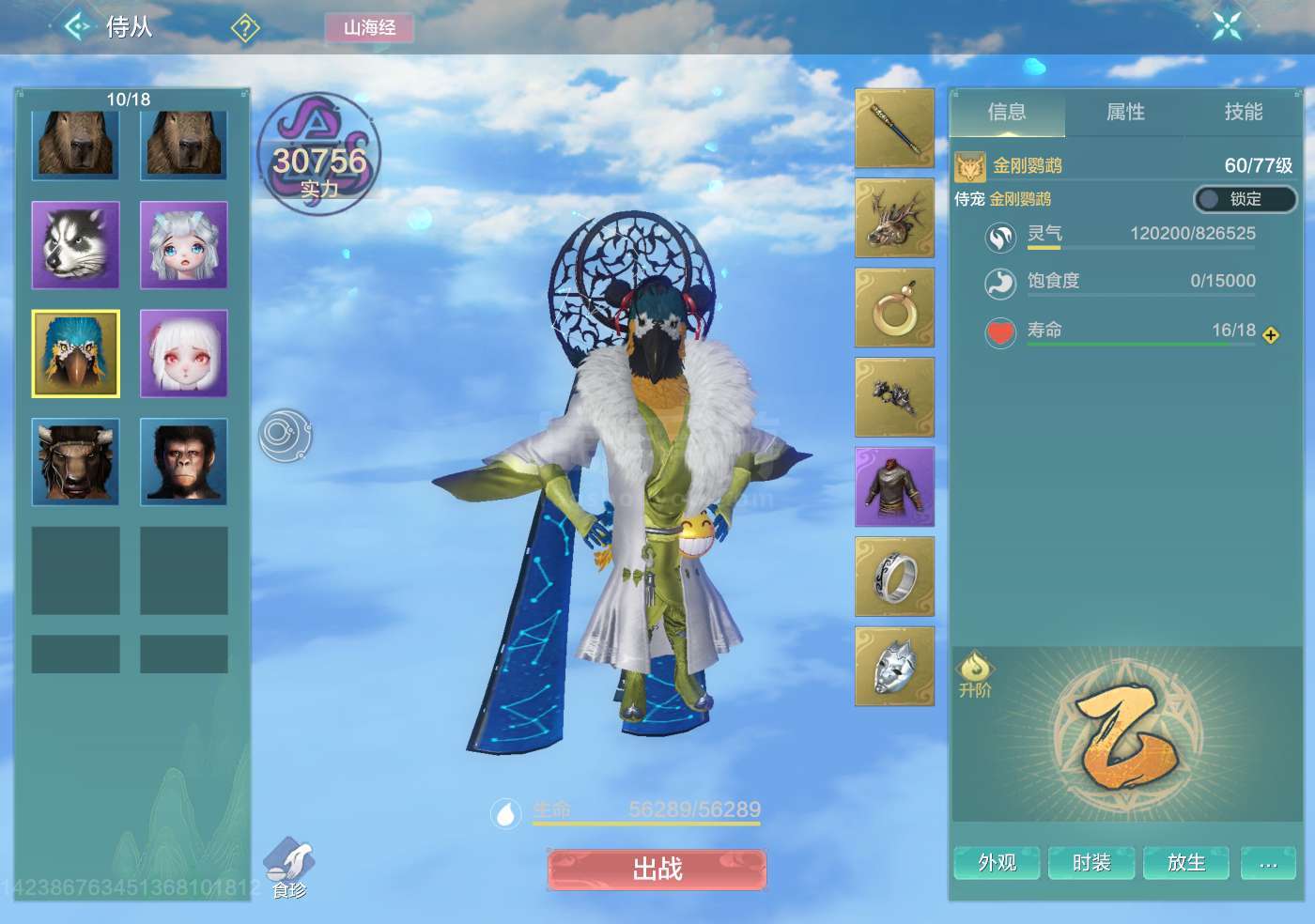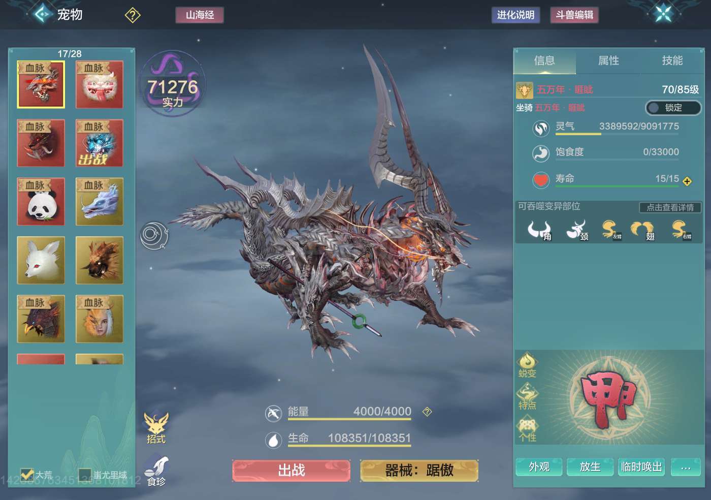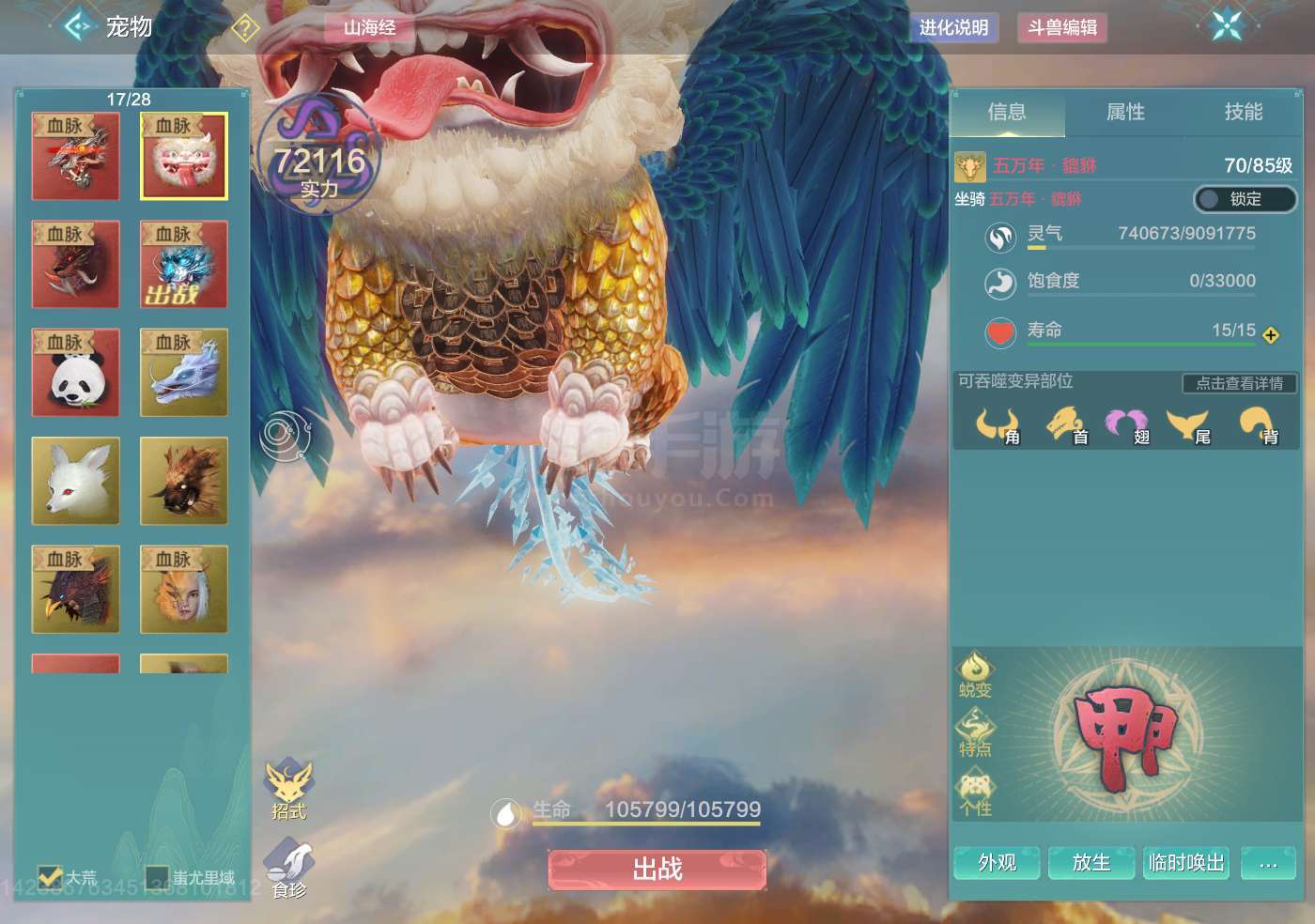 妄想山海【安卓QQ】11万战力,5个五万年宠物,睚眦 熊猫 陛犴 貔貅 穷奇都是五万年,侍从金刚鹦鹉,走金元素