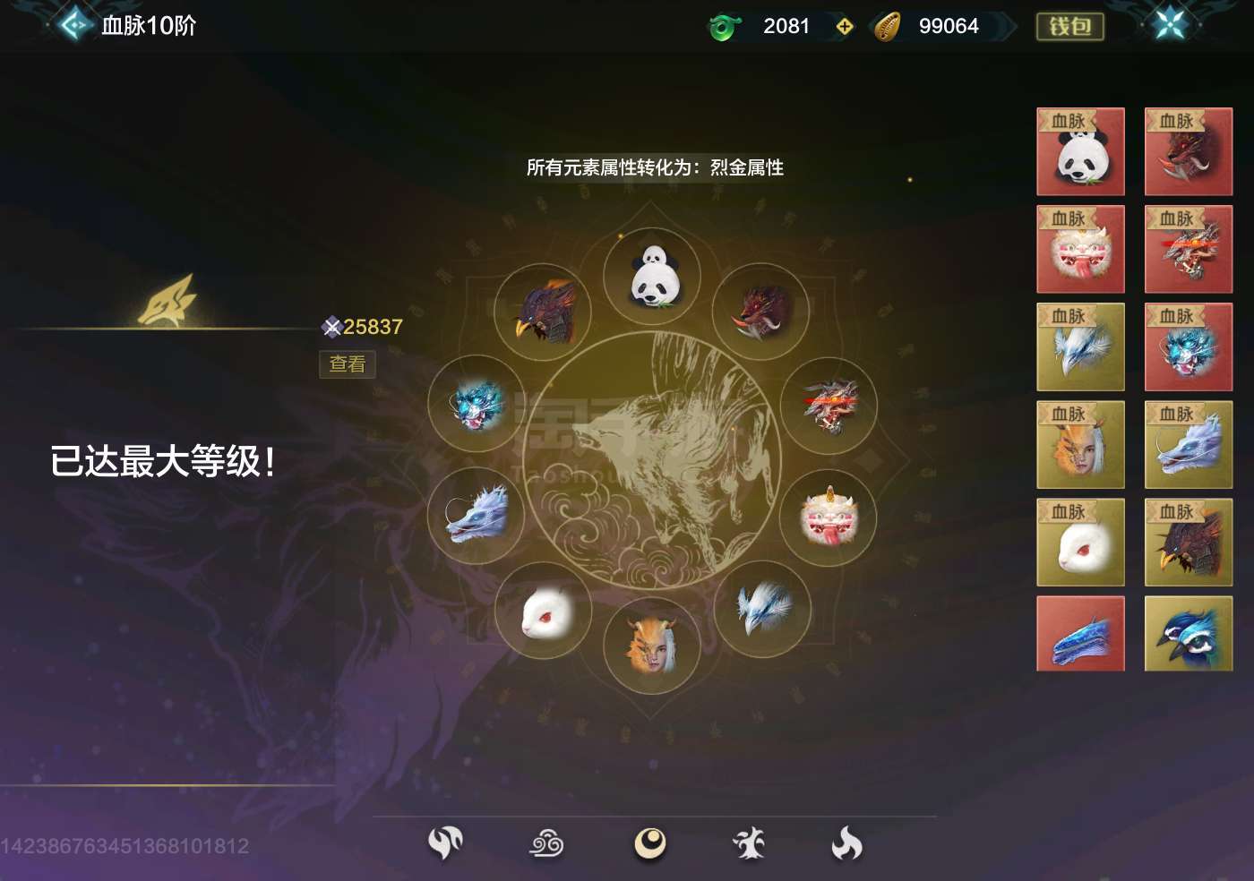 11万战力,5个五万年宠物,睚眦 熊猫 陛犴 貔貅 穷奇都是五万年,侍从金刚鹦鹉,走金元素