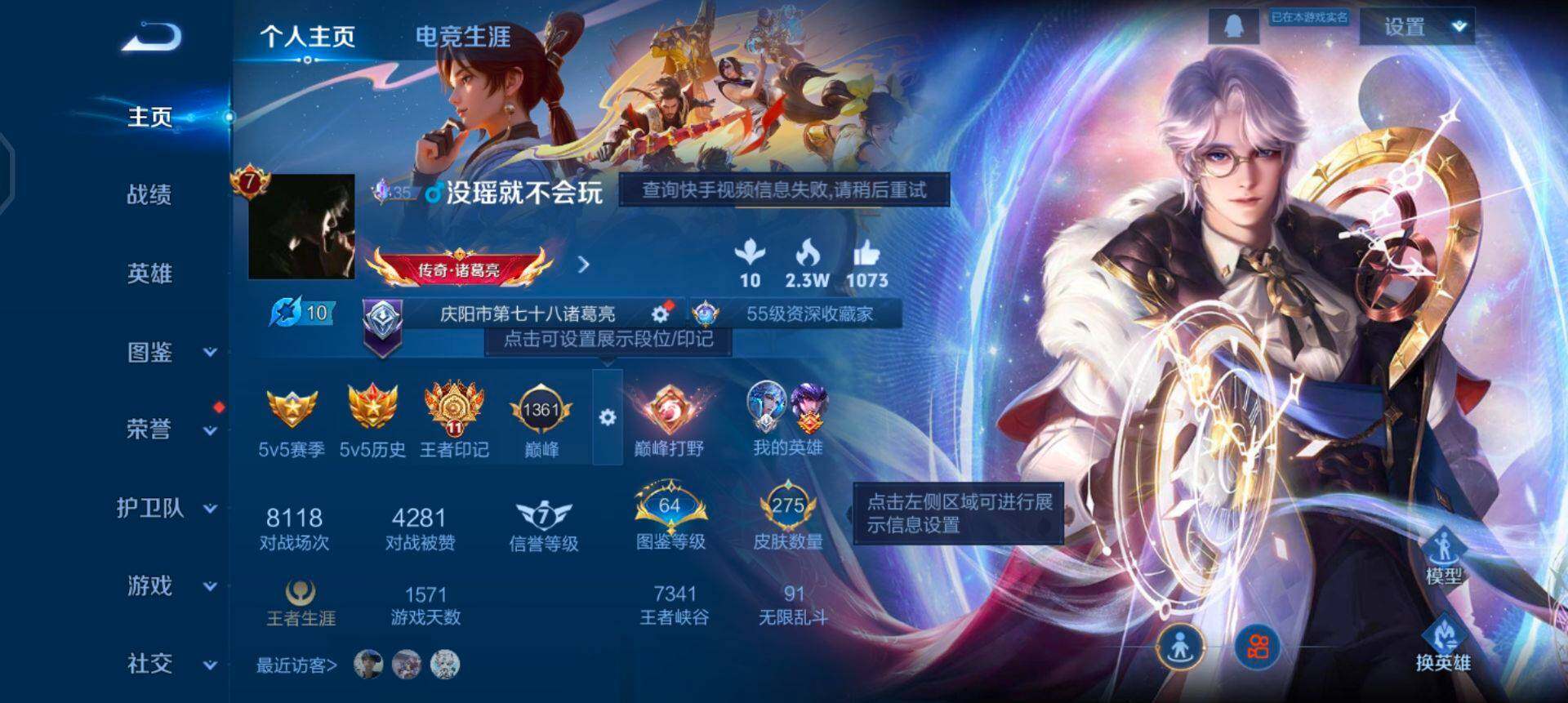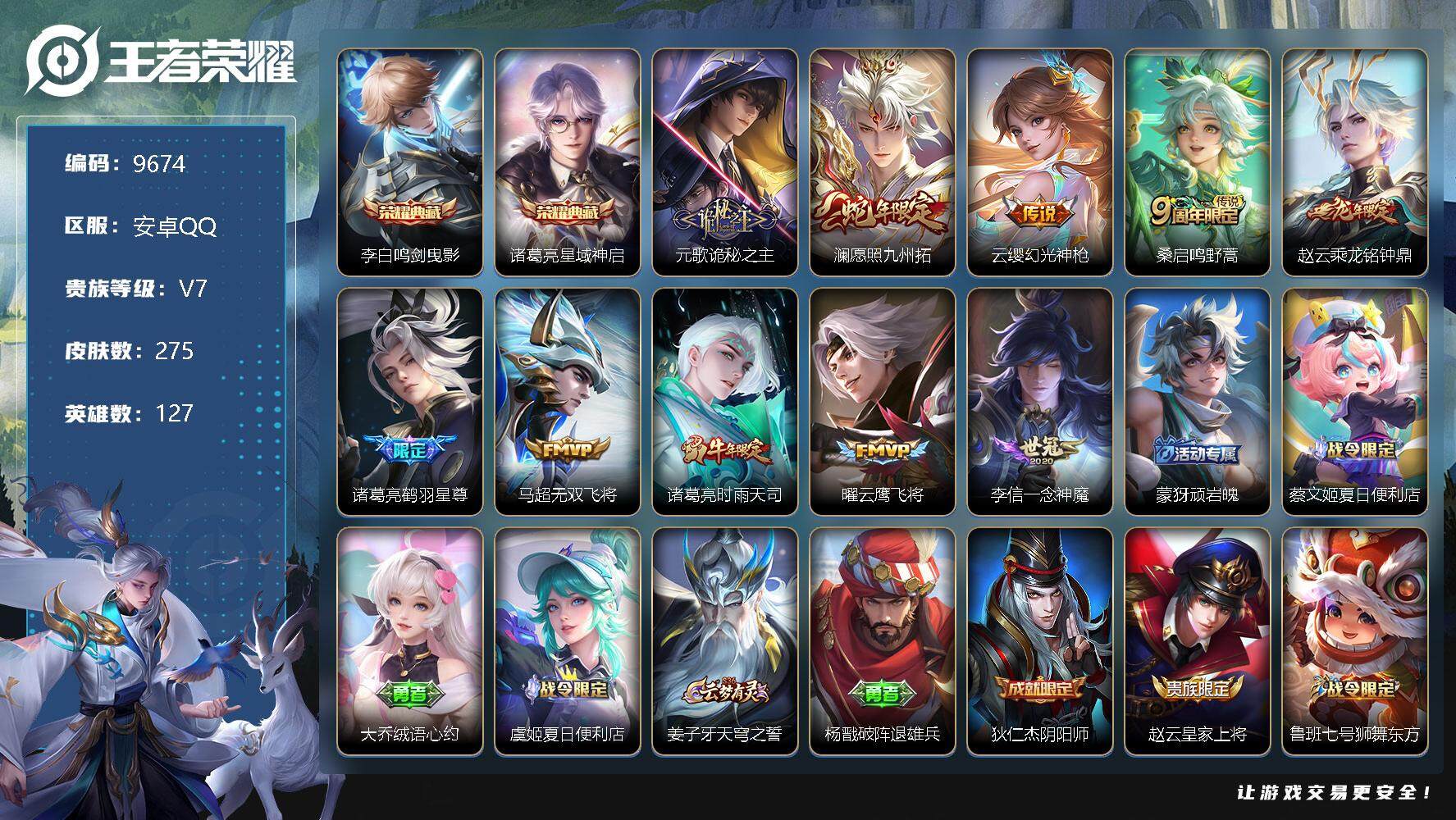 营地账号:1801434227/【商品标题】:W8652 可立即换绑无需挂单养号 铭文满级 典藏2 传说10 按键6 夺宝96 安卓Q-V7-最强王者段位-127英雄-275皮肤-2典藏-0珍品无双-0无双-0珍品传说-10传说-83史诗