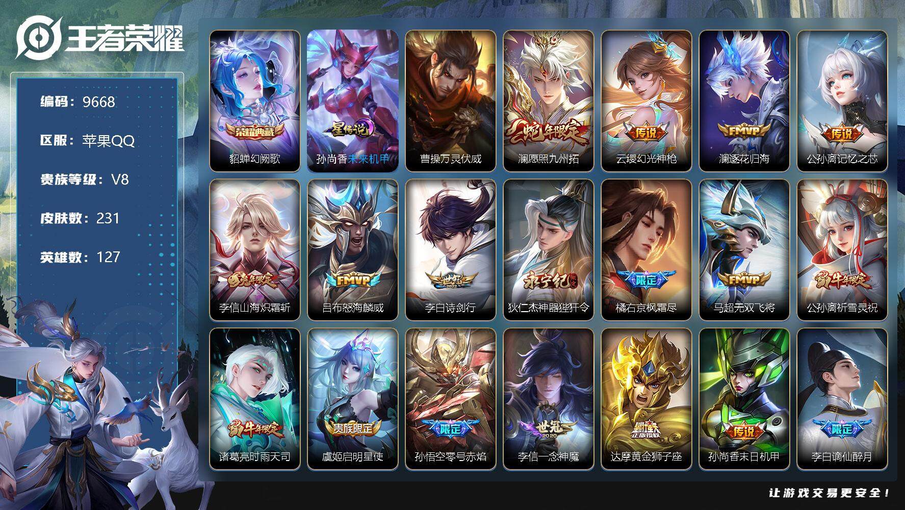 营地账号:2132870546/【商品标题】:W8630 可立即换绑无需挂单养号 铭文满级 典藏1 传说18 星传说1 按键9 夺宝140 苹果Q-V8-至尊星耀V段位-127英雄-231皮肤-1典藏-0珍品无双-0无双-0珍品传说-18传说-57史诗