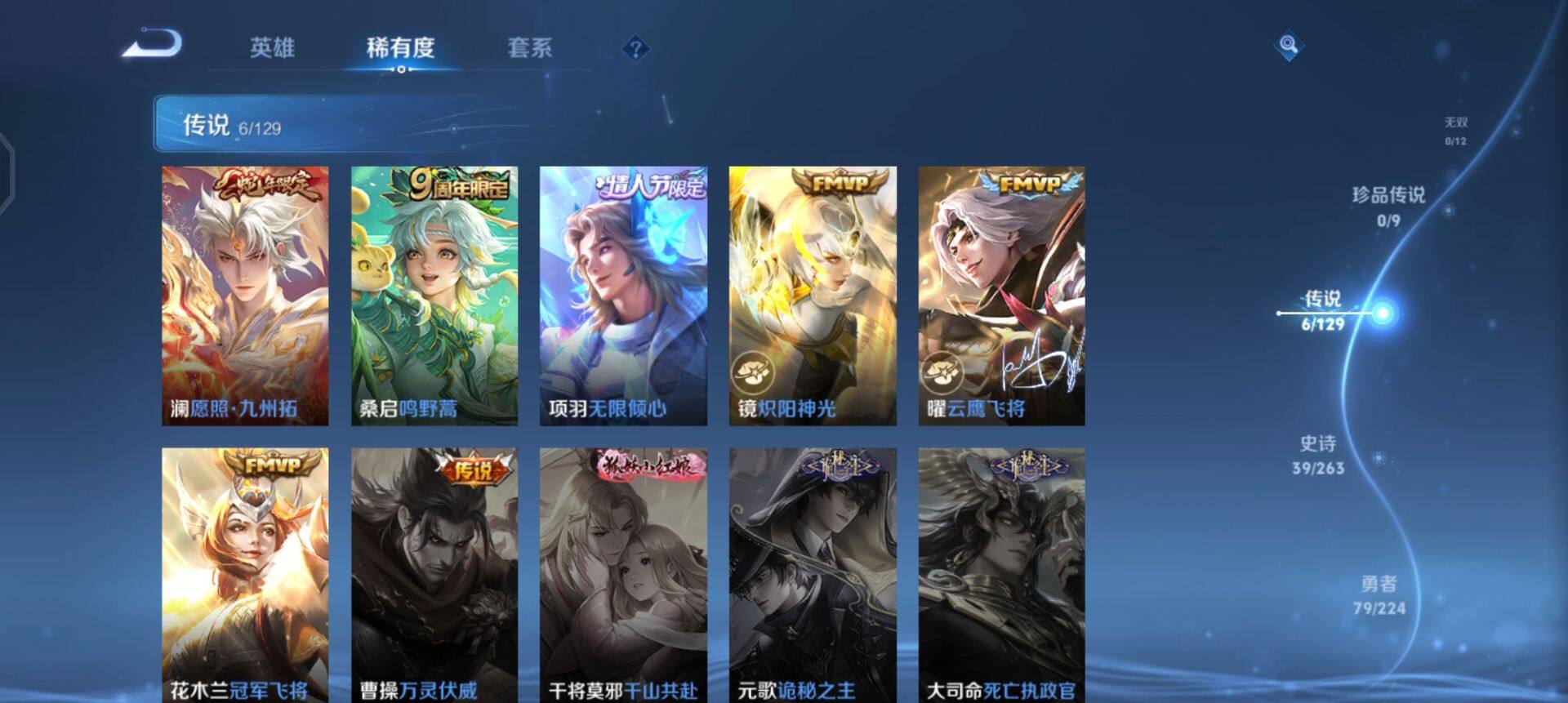 【传说皮肤】:澜愿照九州拓,桑启鸣野蒿,项羽无限倾心,镜炽阳神光,曜云鹰飞将,花木兰冠军飞将