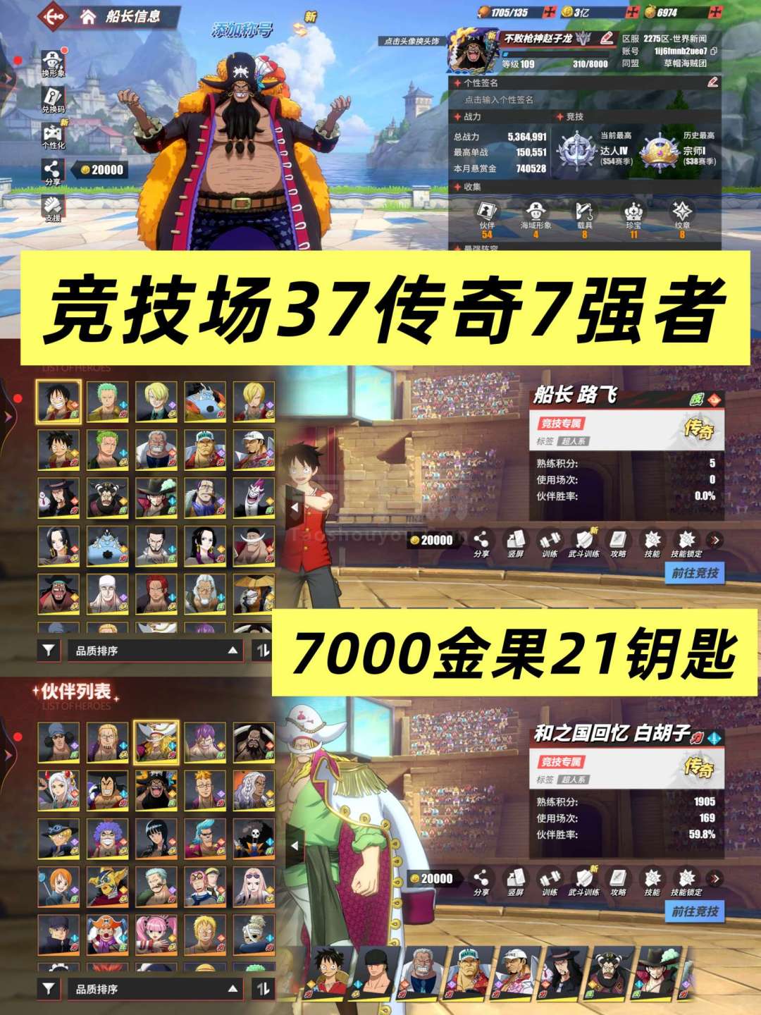 竞技场37传奇7强者 青白 青雷 和路 和索 新鹰眼 大和 四皇黑胡子 7000金果21钥匙 viv