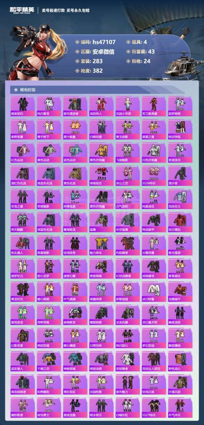 hs47107 安卓v-17王牌印记-43粉装-24特效枪-4载具-150050热力值-283套装