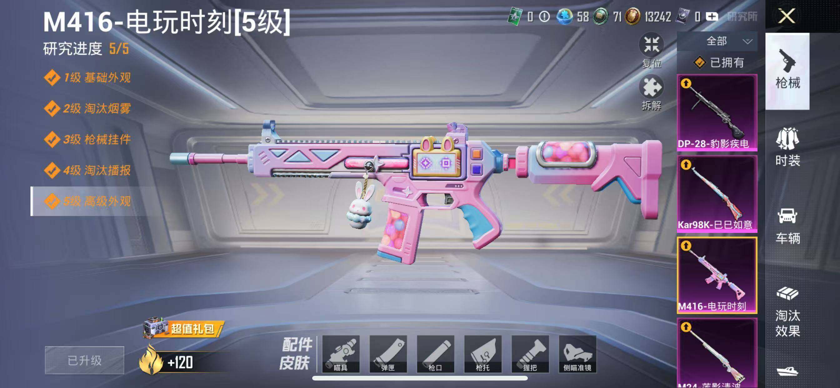 苹果 手Q-6粉装-6特效枪-0载具-3粉色飞行器-47576热力值-8王牌印记-85套装-137枪皮